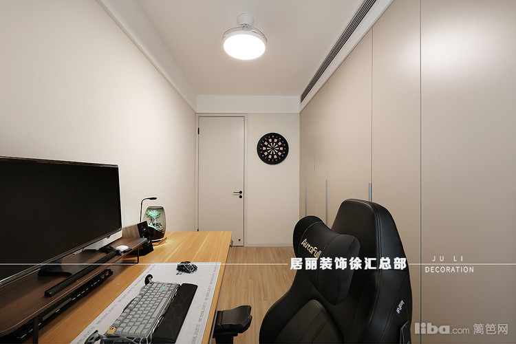 书房是以储物和办公为主,一整排的衣柜采用的折叠门设计,能够全部打开,拿取衣物更加方便,一个大的办公桌也满足了业主在家办公和打游戏的需求。