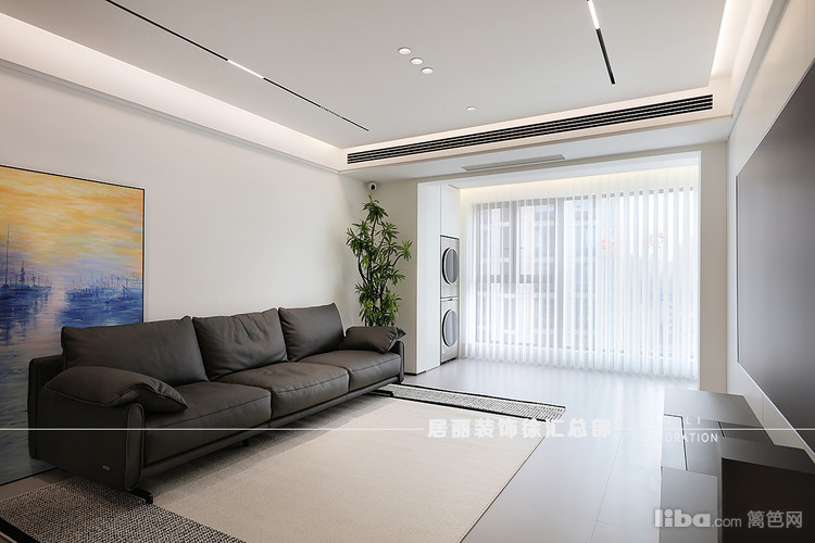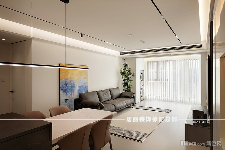 阳台窗户引入自然光线,进一步放大了空间感。天花板的线性灯带增添了设计感,与整体色调协调统一。