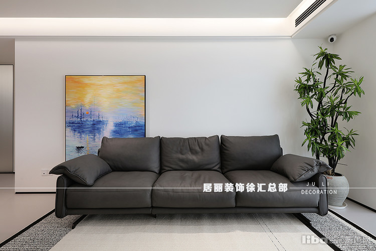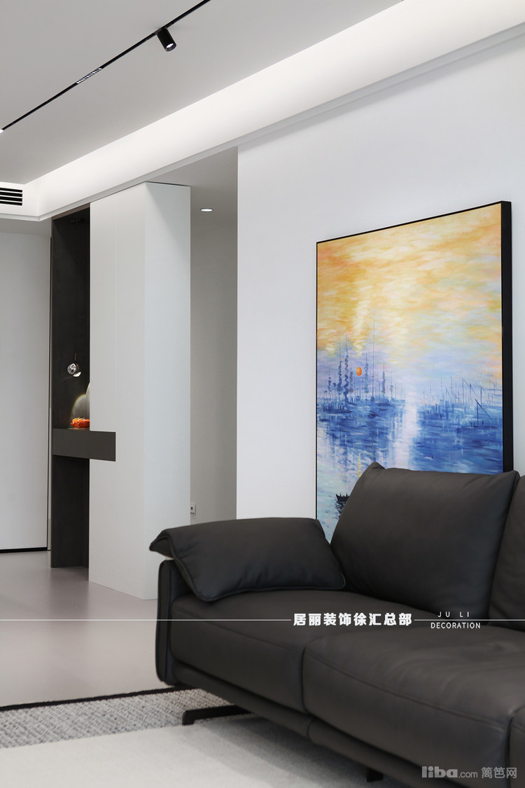 黑色沙发与彩色装饰画形成鲜明对比,凸显出简约中的富有创意。阳台窗户引入自然光线,进一步放大了空间感。