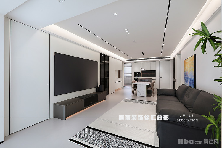 客厅整体简约大气,白色调的墙壁和瓷砖营造出一种清新舒适的氛围。