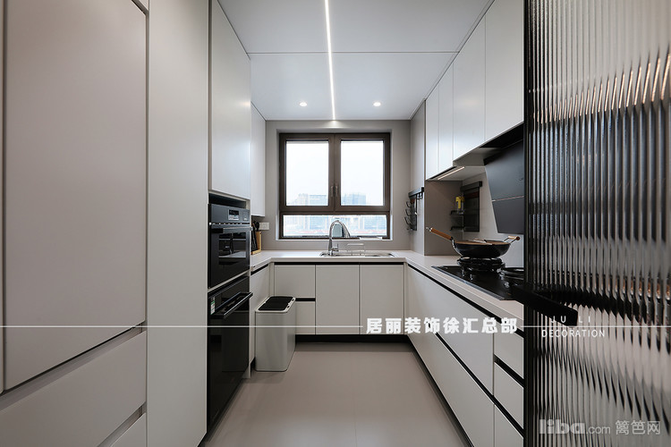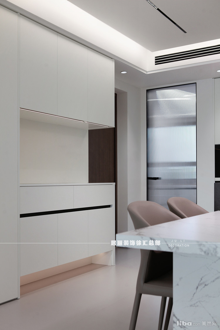 个空间采用白色系的色调,搭配灰色的线条流畅的橱柜门板和金属质感的百叶窗幕墙,形成简洁干净的视觉效果。