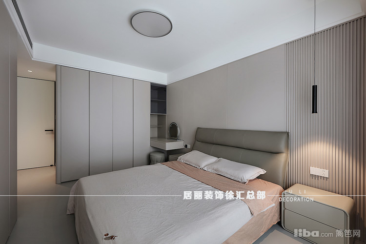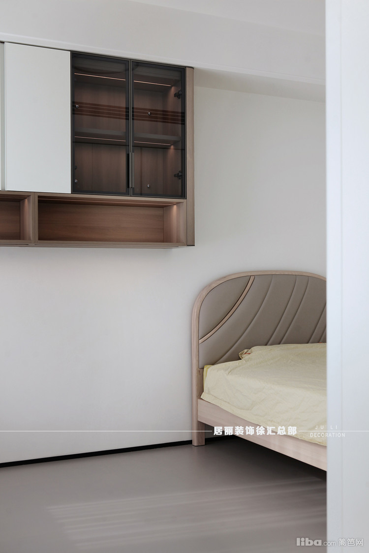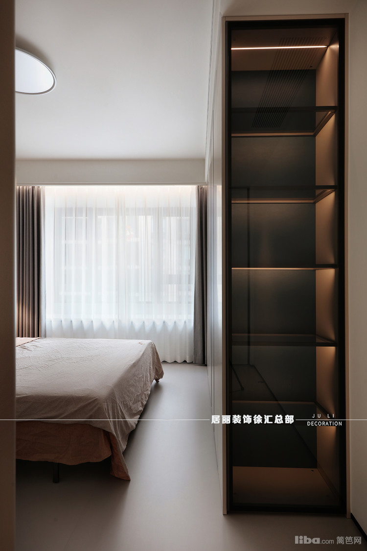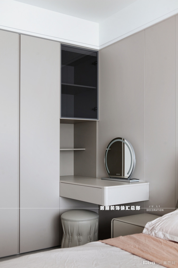 嵌入墙面的储物柜采用无把手设计,维持了简洁流畅的立面效果。