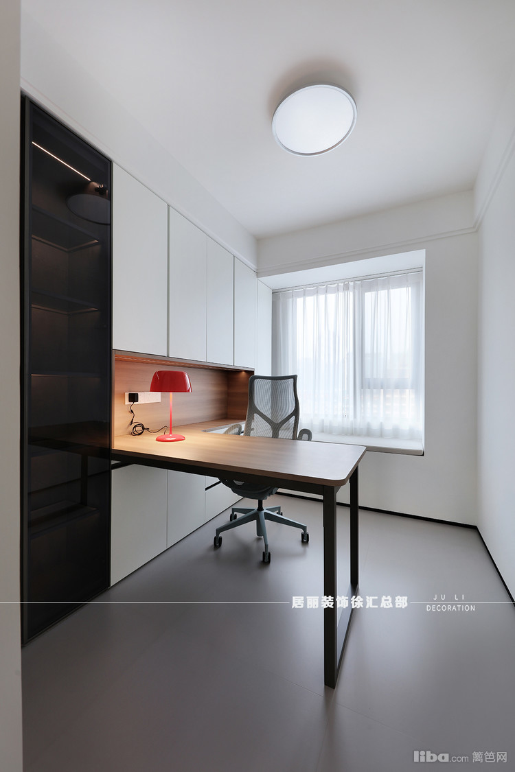 白色墙面和柜体带来了干净利落的视觉效果,黑色的大型收纳柜和台灯形成鲜明对比,增添了设计感