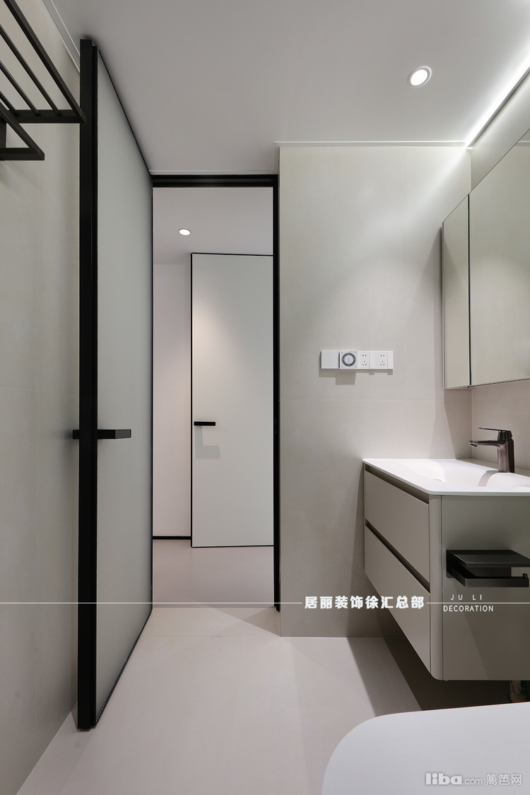 卫生间延续了空间整体的极简美学,墙面嵌装隐藏式收纳系统。