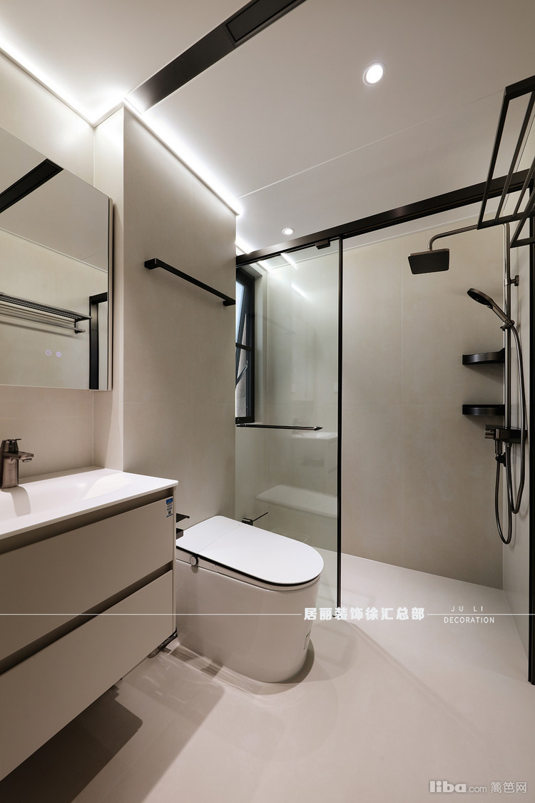 淋浴区以整块透明玻璃完成干湿分离,顶部嵌入的线型排水槽彰显对细节的精益求精