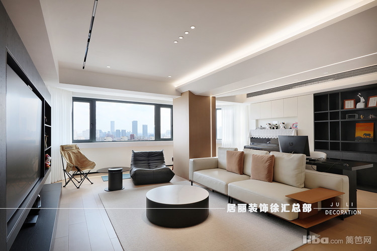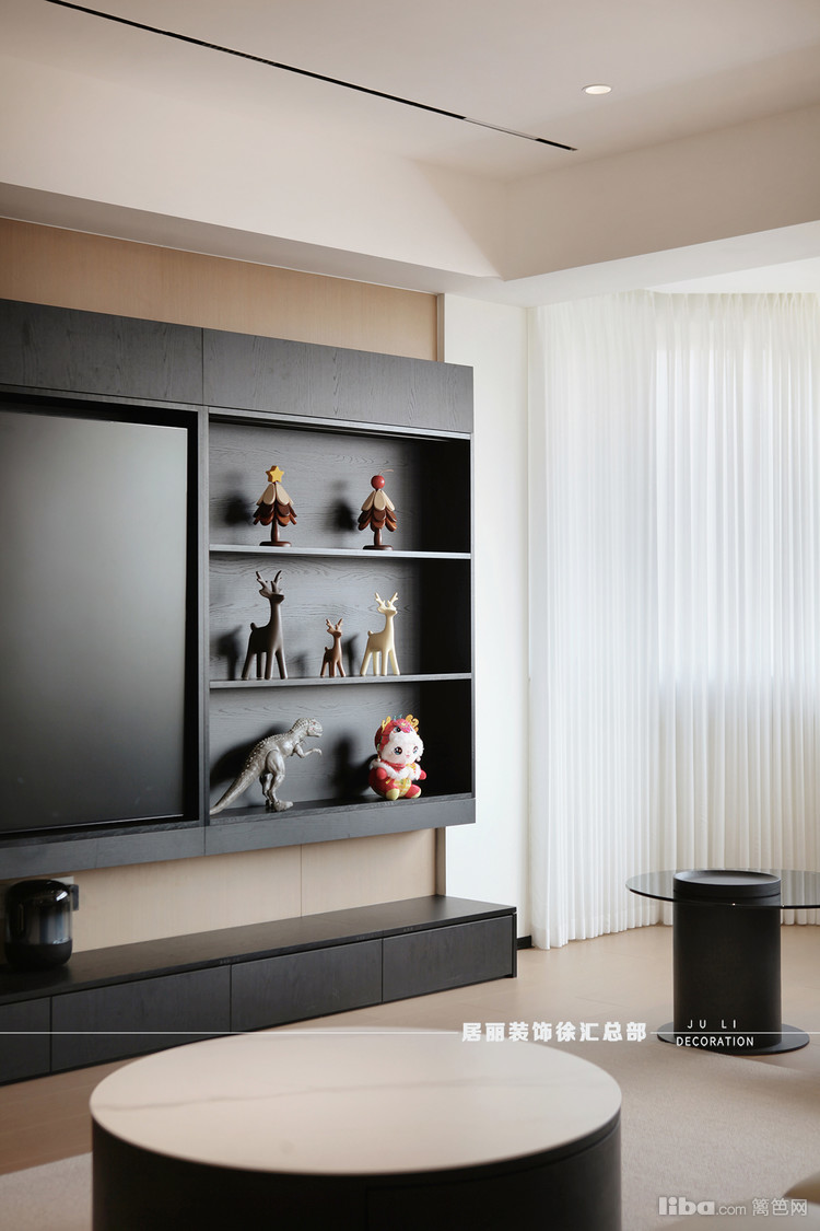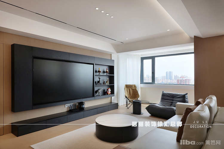巨大的液晶电视成为客厅视觉焦点,搭配黑白造型鲜明的装饰品,营造出一种强烈的视觉冲击力