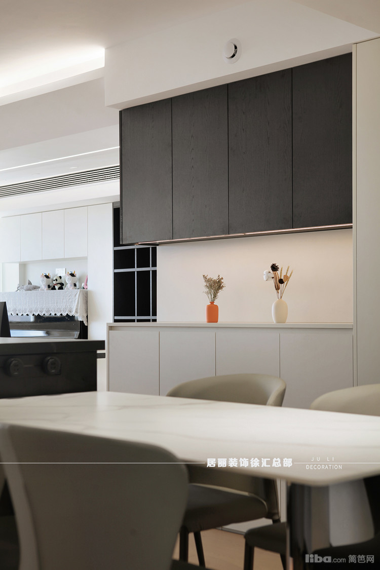 黑色的餐边柜柜体与白色墙面形成鲜明对比,而大理石纹理的餐桌面则为空间增添了质感。
