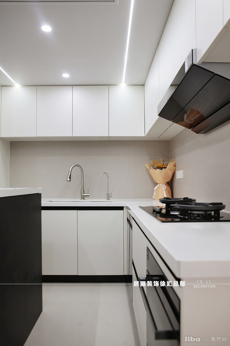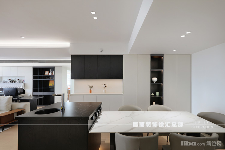 白色橱柜和大理石台面与黑色厨具设备形成了鲜明的视觉对比,黑色拉门柜体与灰色墙面巧妙融合