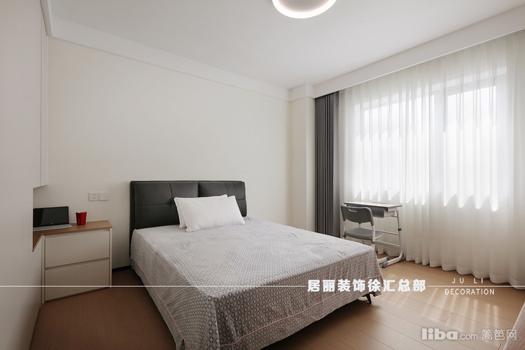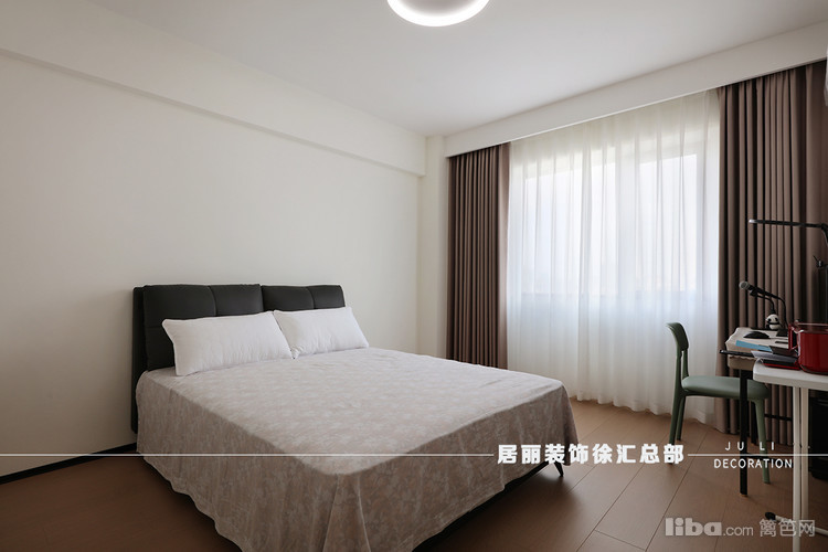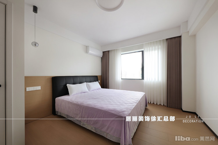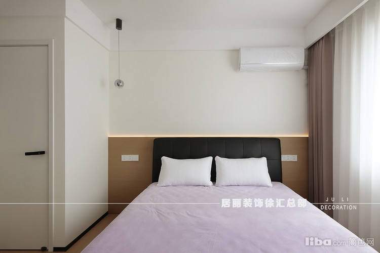 次卧采用清新的米白色基调,搭配黑色的床头柜和床头板,形成了和谐的视觉对比。