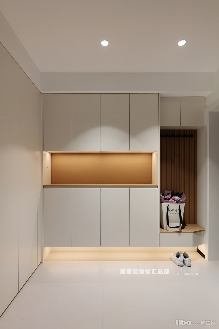 入户玄关处柜体表面采用无拉手的整体式设计,线条简练而有设计感。