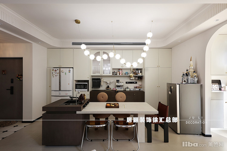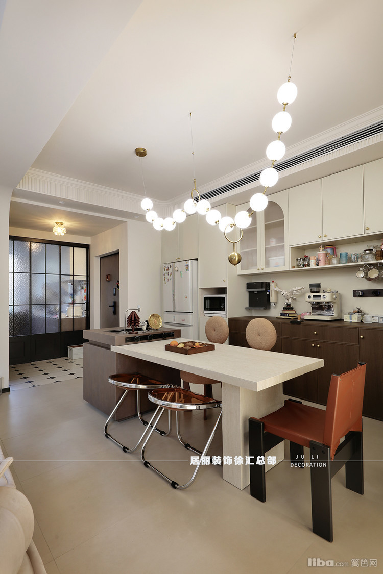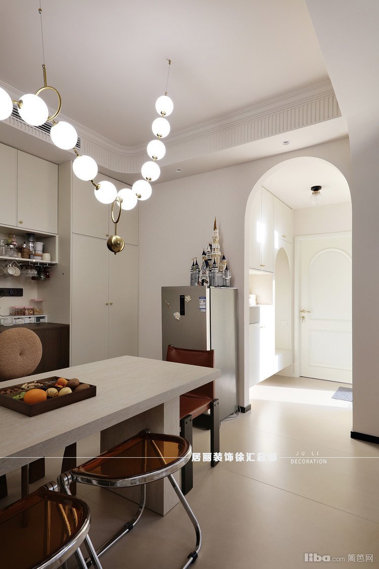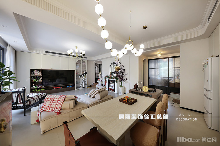 设计师在客厅和餐厅各做了一排整体电视储物柜和餐边柜,餐厅中设置了倒台。