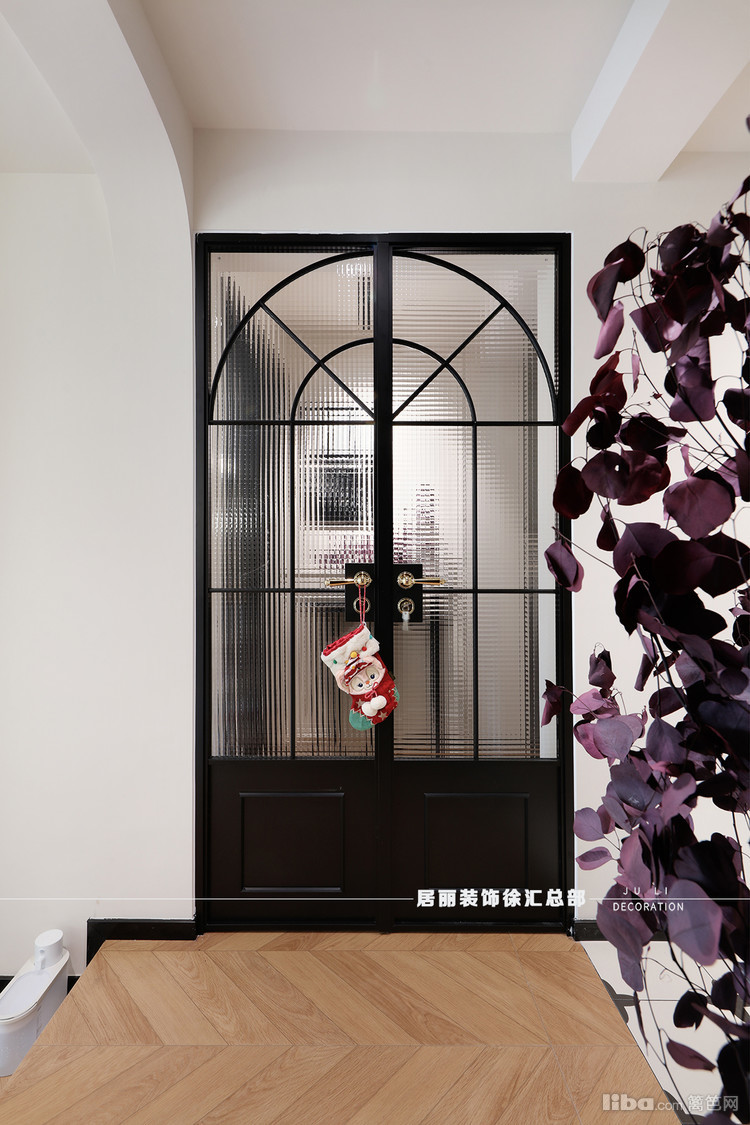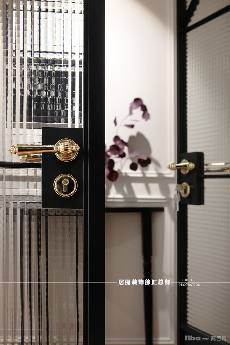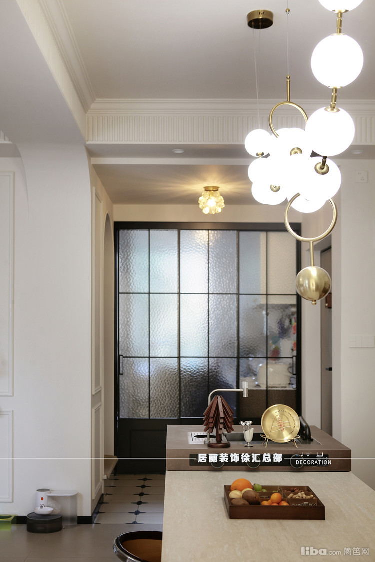 厨房位于入户门的右边。设计师采用了三联动极窄边六分格移门,配上钻石玻璃。