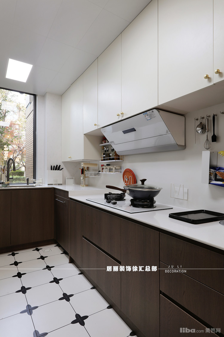 厨房内部上柜和下柜柜门板采用两种颜色,有重有轻。地面采用法式小花砖。