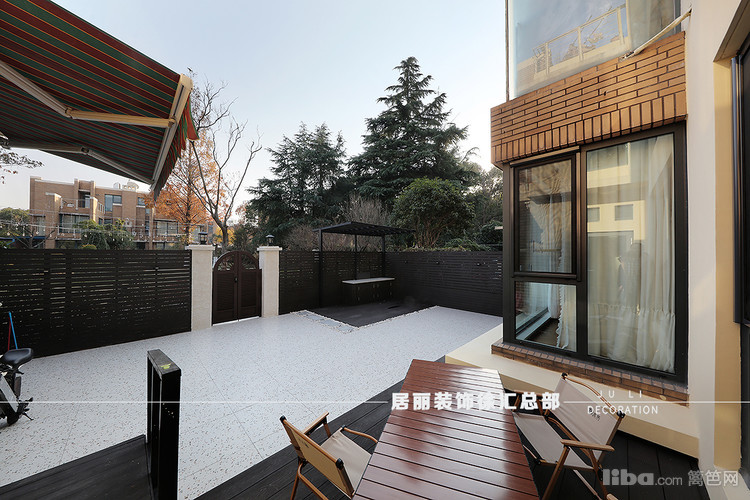 有一个三十多平方的天井。天井除了满足业主晾晒衣物的功能外,塑木护墙板围绕天井分割院子内外。