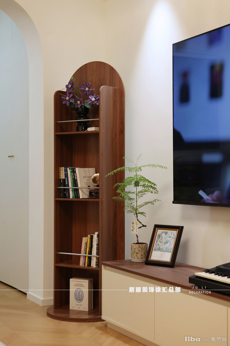 空间的焦点是一张柚木色的中古电视柜,柜体带有精致的黄铜拉手。