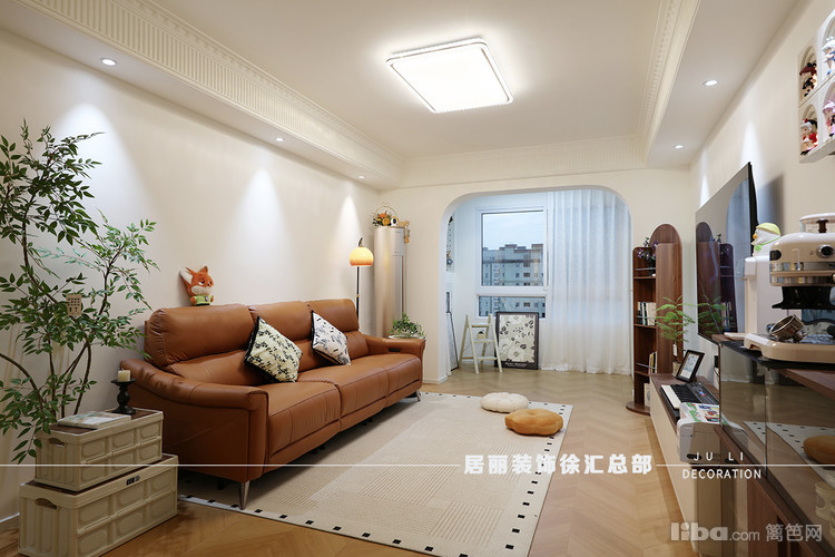 主沙发是一张线条圆润的皮质沙发,颜色为更浓郁的拿铁色。