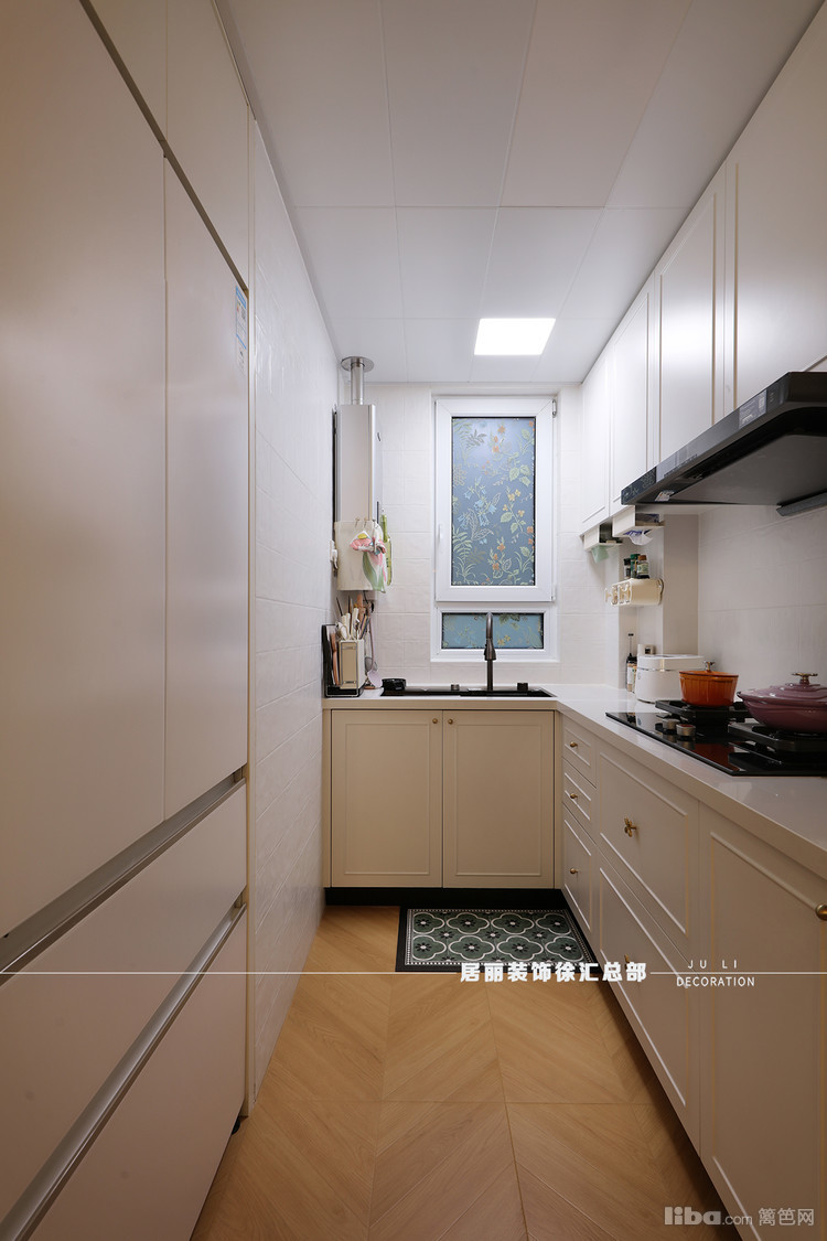 墙面采用机器调色涂料,呈现柔和的奶油白色,地面通铺橡木人字拼地板砖,颜色为浅蜜糖色。