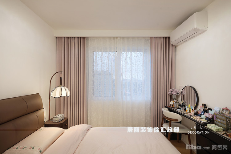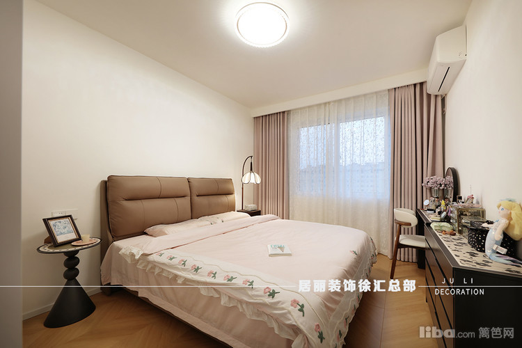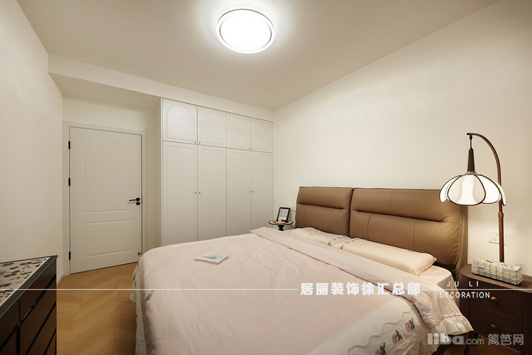 床头背景墙采用奶茶色,保留奶油色墙面。床架本身是低矮的悬浮式设计,软包床头为头层牛皮,颜色是杏子茶色。