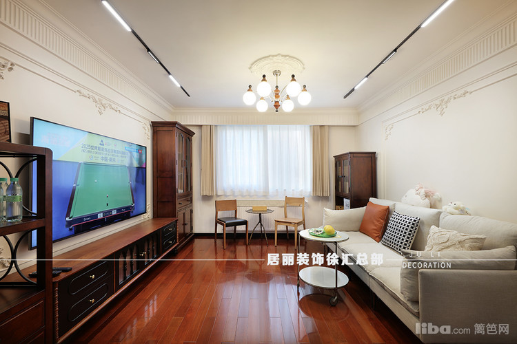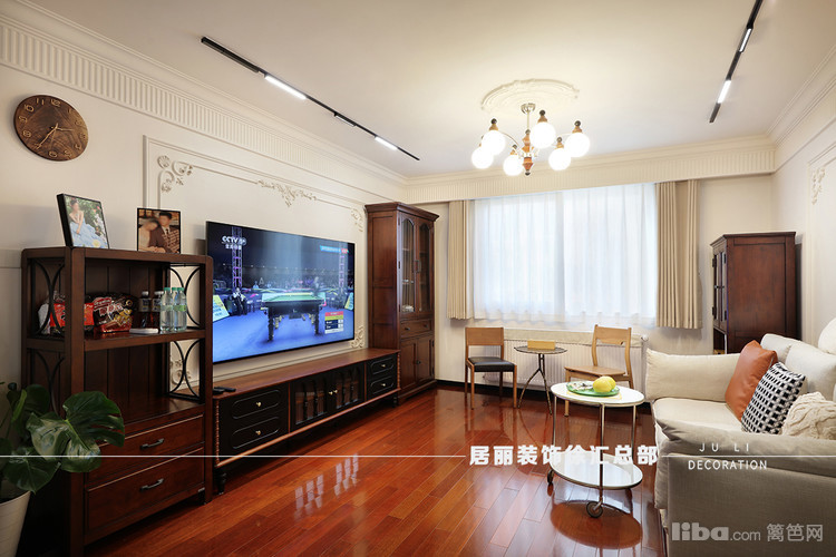 电视背景墙则用了复古电视柜柜搭配背景墙。