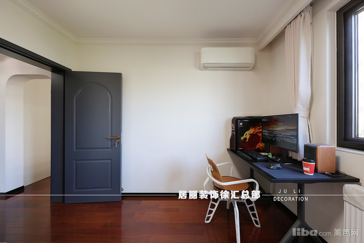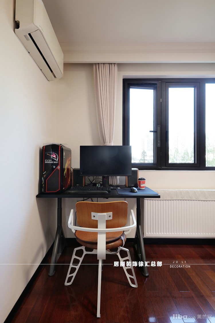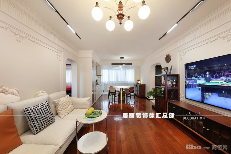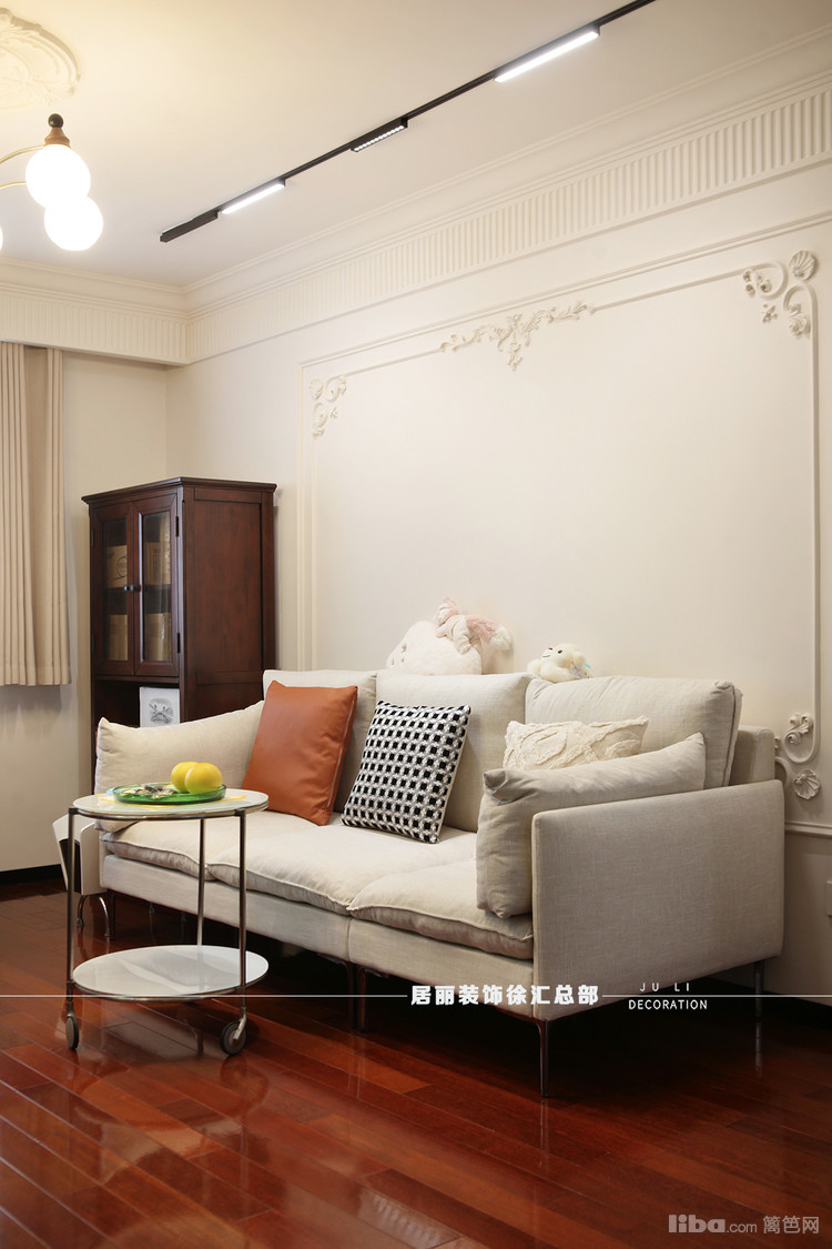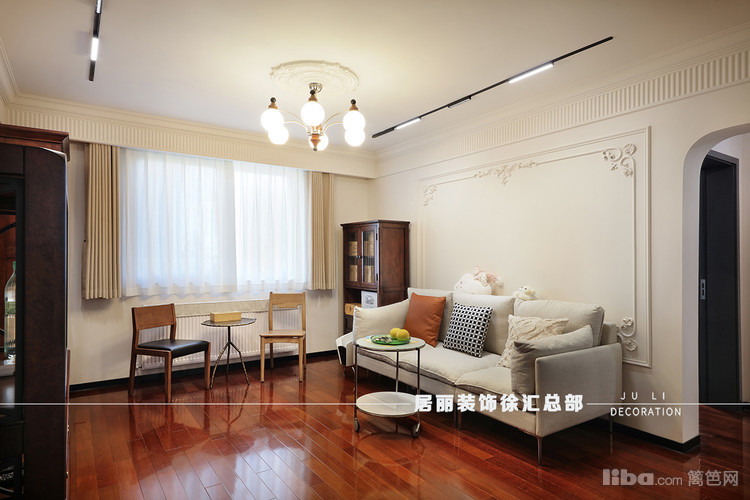 在整体空间顶面用了“钢琴键”石膏顶角线,地面的实木地板进行了打磨修复。