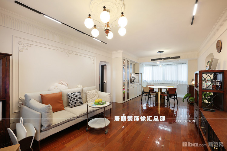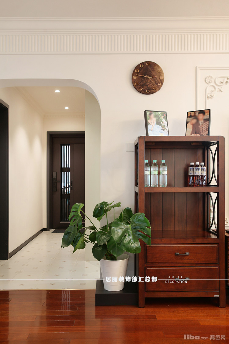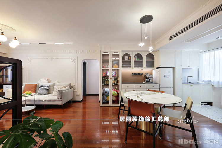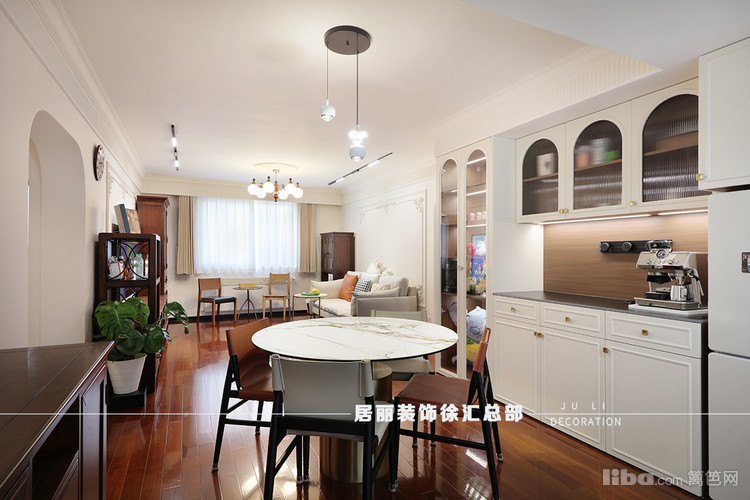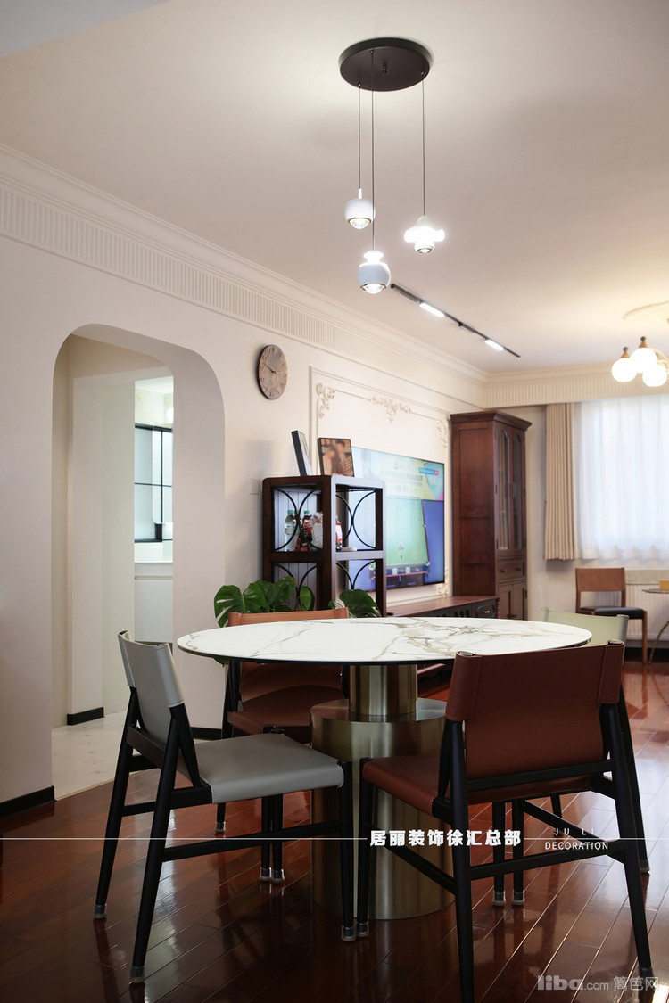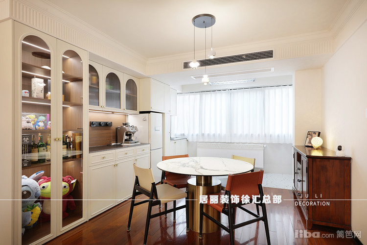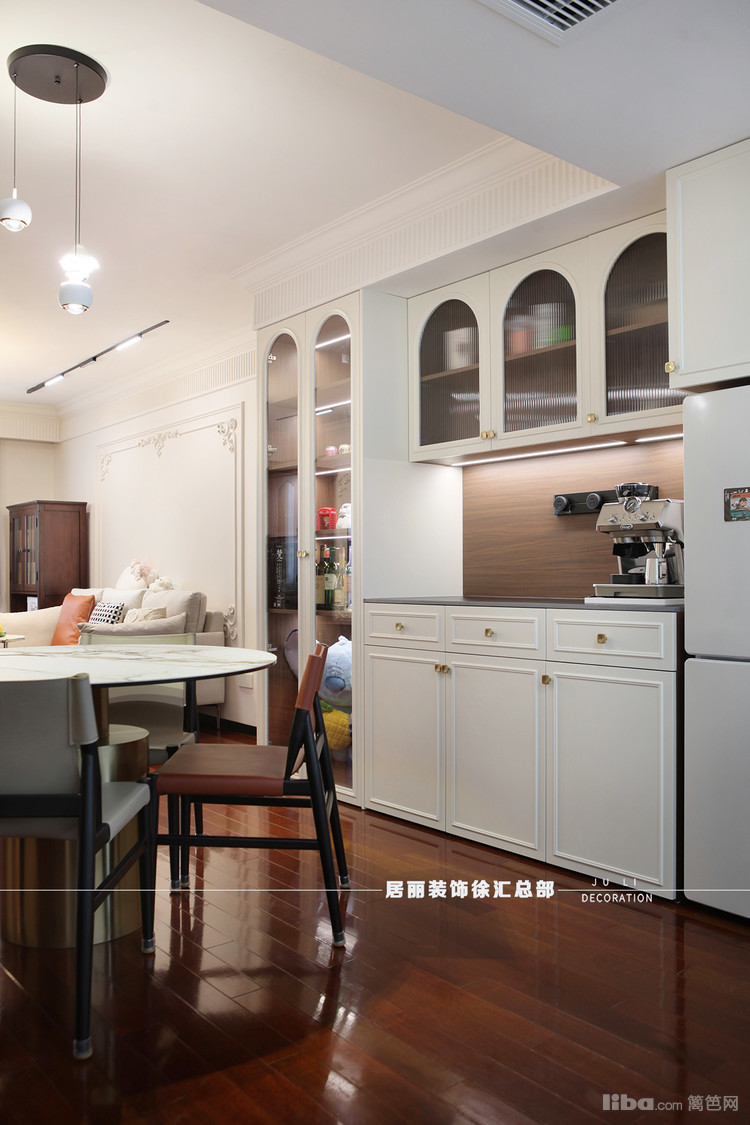 餐厅区域各做了一排餐边柜和复古斗柜。餐厅中设置了小圆桌。