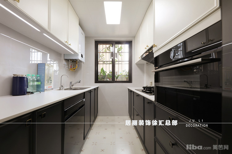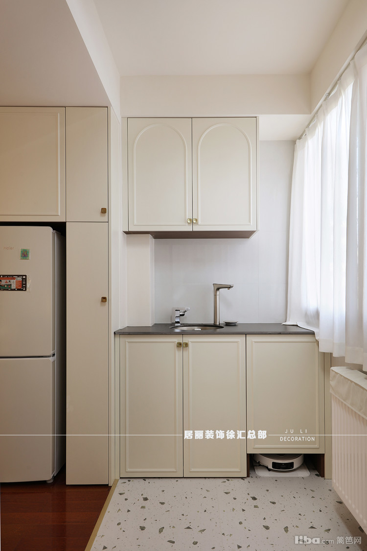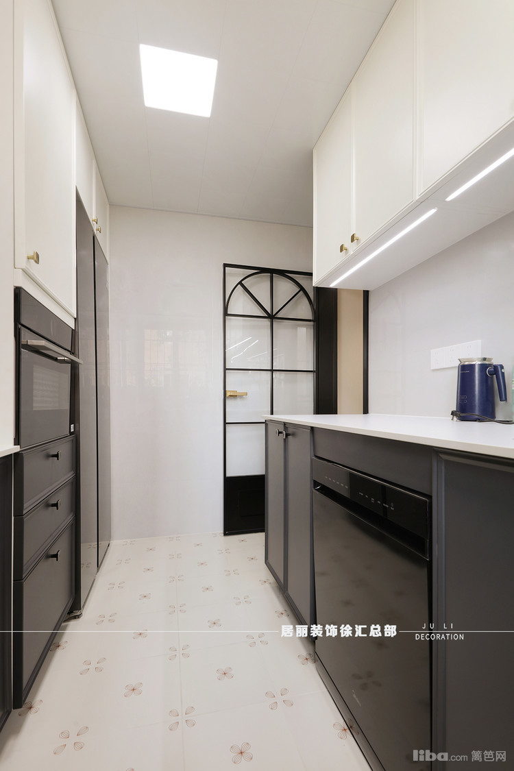厨房门采用了法式窄边框圆弧金属门,内部上柜和下柜柜门板采用两种颜色,有重有轻。地面采用法式小花砖。