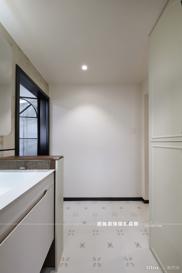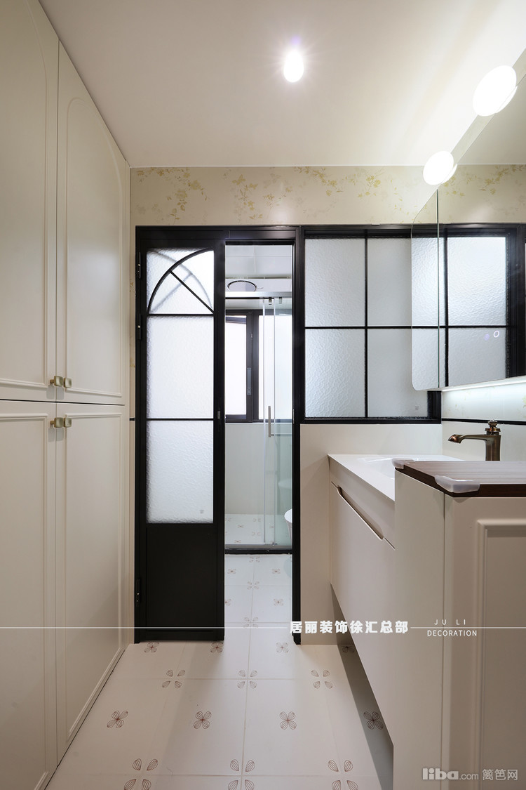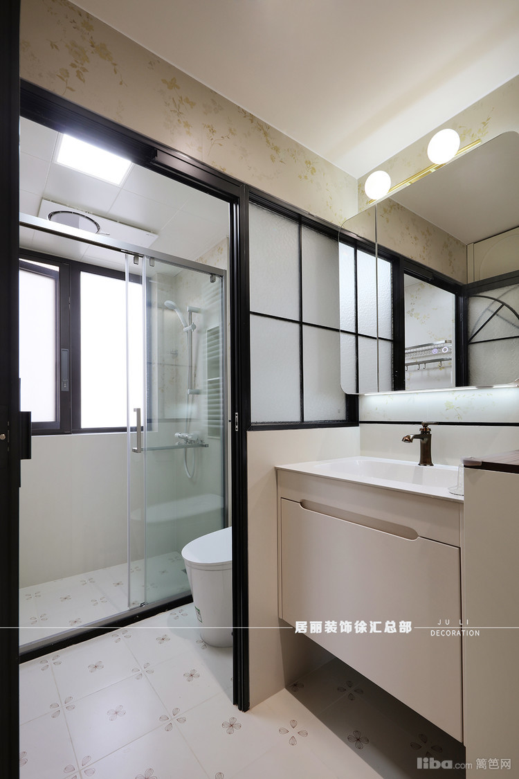卫生间采用了干湿分离的设计。PT门配法式格子玻璃,让干区略显明亮。台盆边还增加了储物柜。整体配色为花砖和窄边腰线相结合。