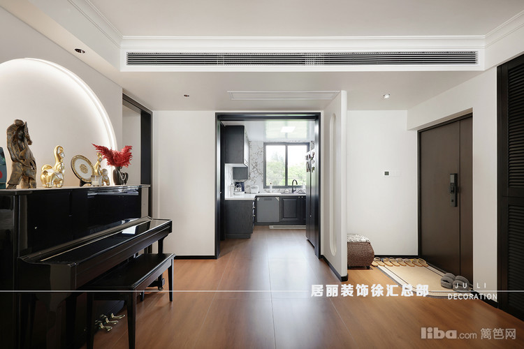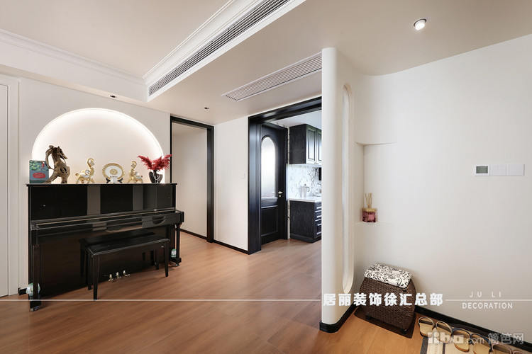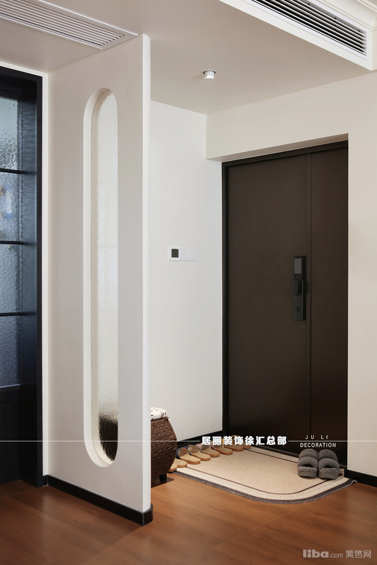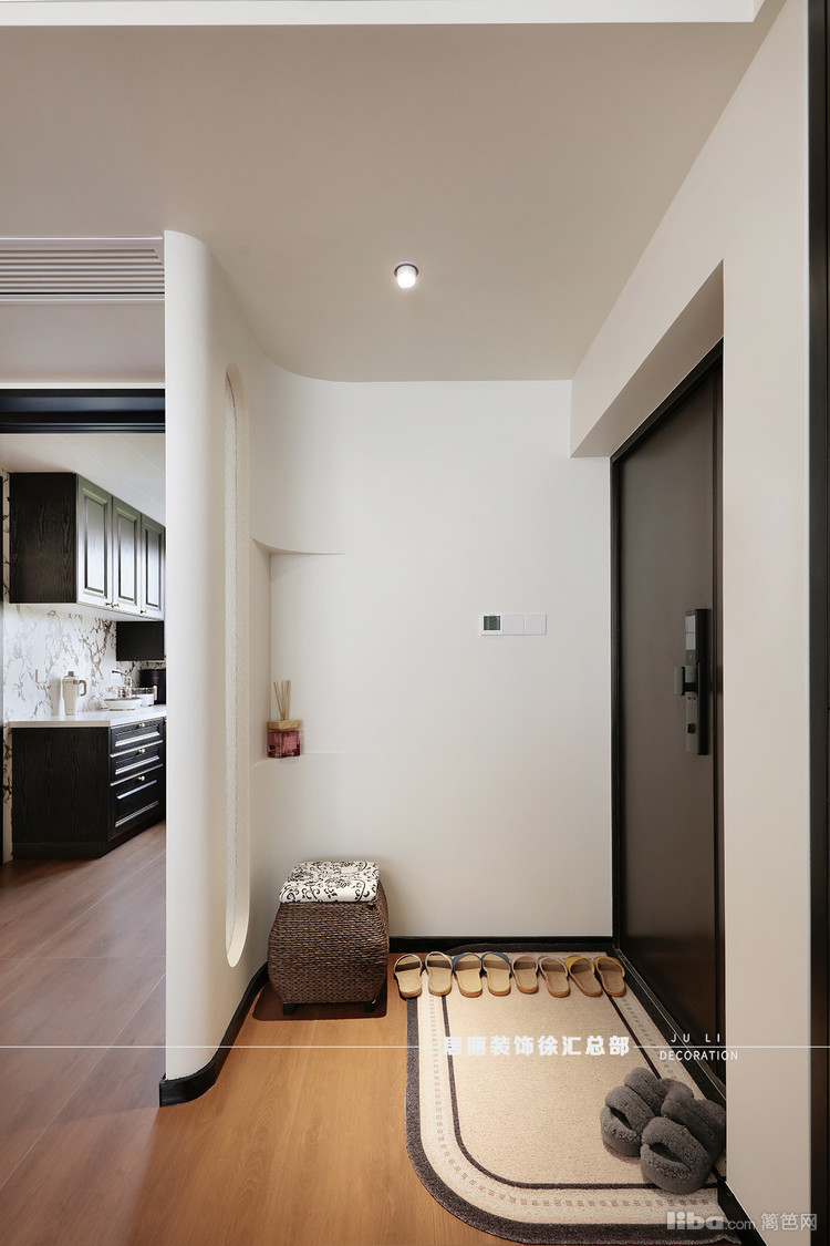 进门玄关功能巧思上,弧形玄关遵循“通透不挡光”原则,半透墙弧形设计可预留穿鞋区,搭配小巧的布艺换鞋凳;柜体侧面增设挂钩区,方便悬挂外套、包包