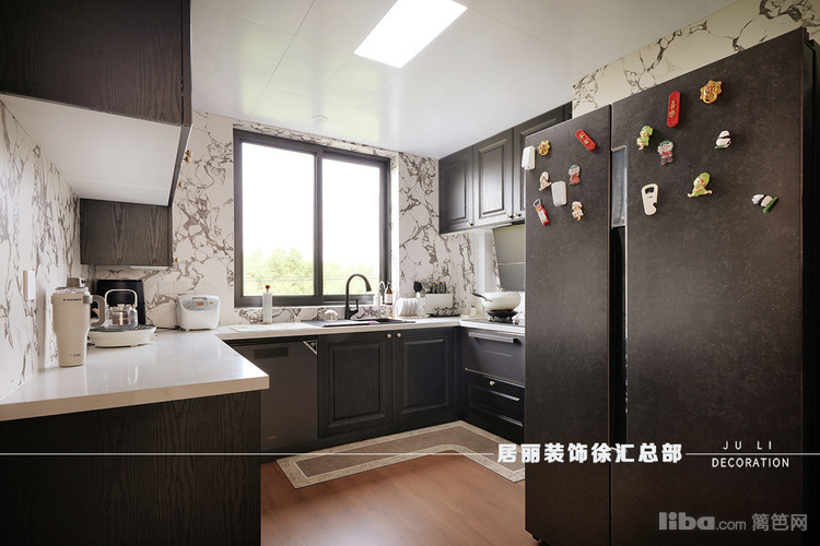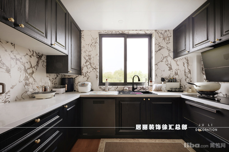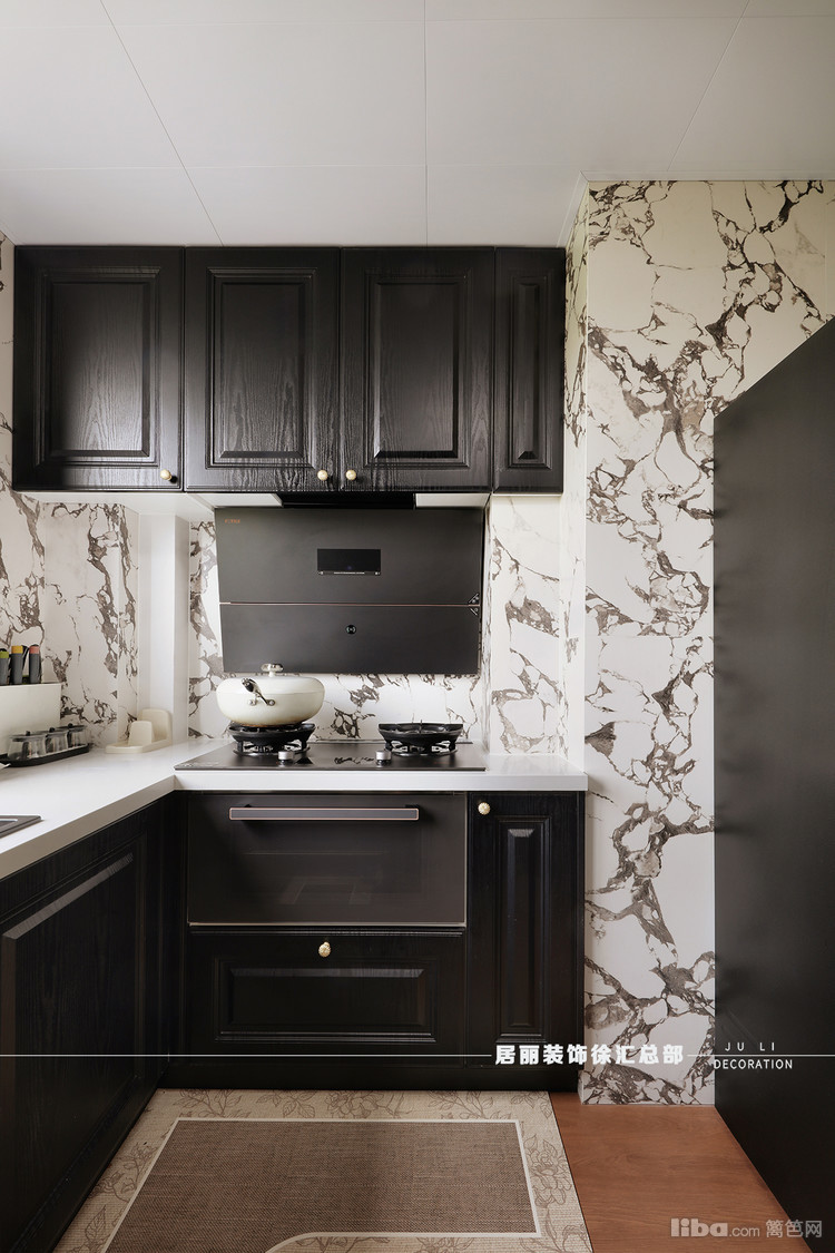 黑色橱柜的深沉质感与宝格丽瓷砖的奢石纹理形成碰撞,既保留美式的松弛,又增添轻奢气场。