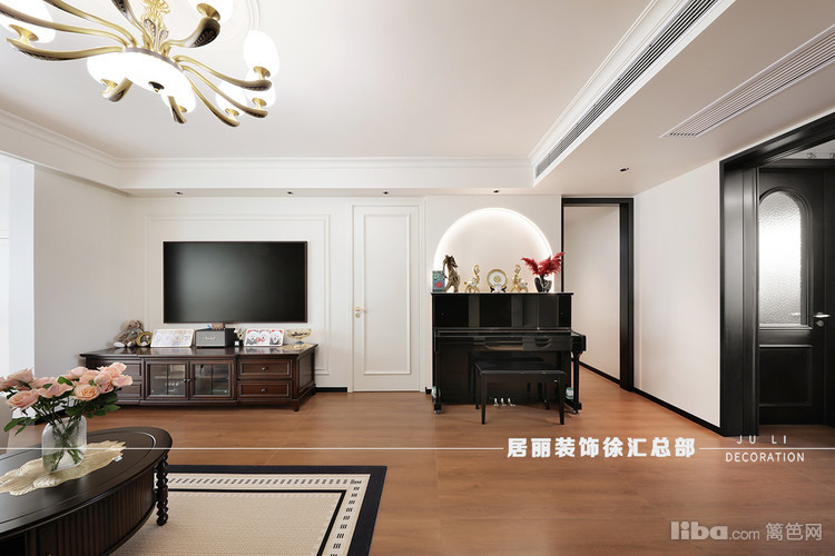 复古线条与隐藏门设计相融,美式背景墙不仅是影音核心,更是藏起生活琐碎的巧思载体。
