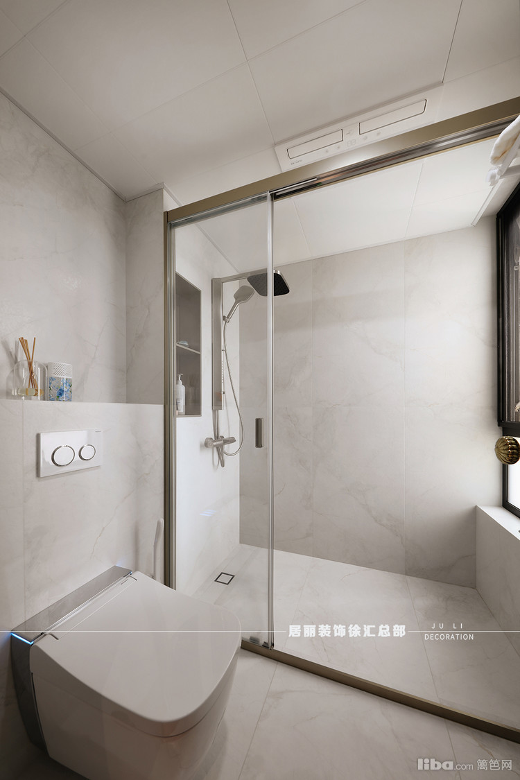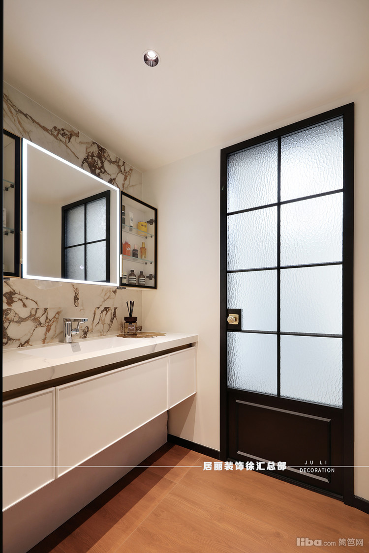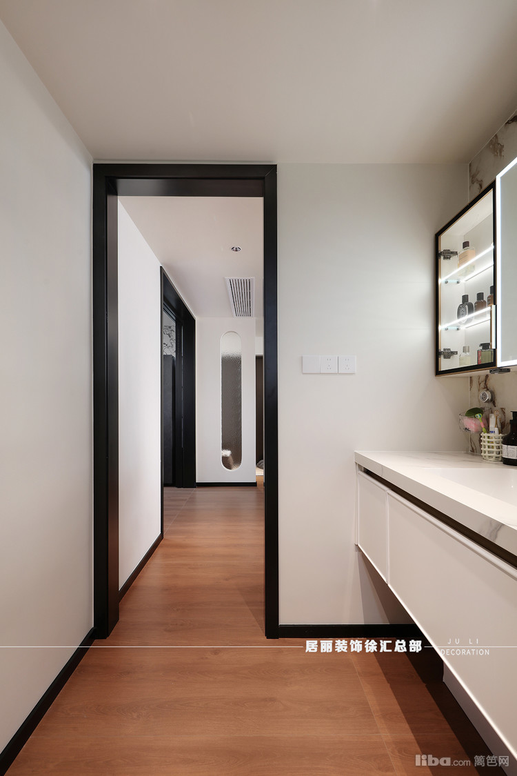 卫生间干湿分开设计强调仪式感与高效共享。定制加长的一体式台盆浴室柜成为亮点。搭配悬空设计,轻盈易清洁。