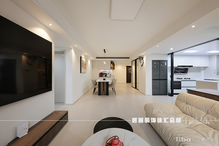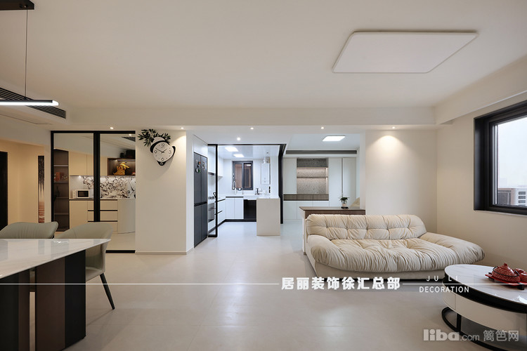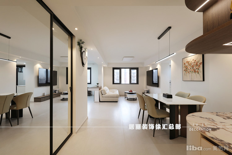 整个客餐厅空间为长方形,区域划分清晰,视觉比较明亮、宽敞和舒适。在整体配色上,采用了通铺柔光大砖