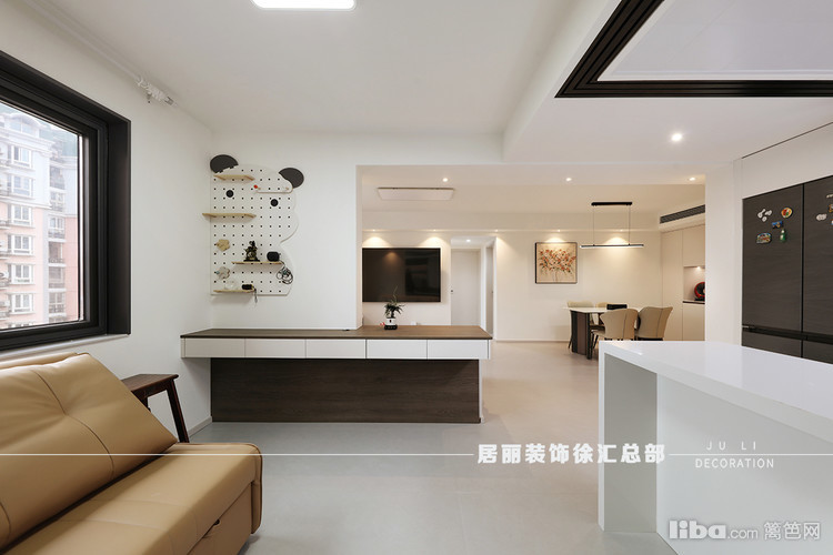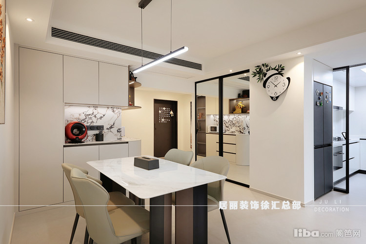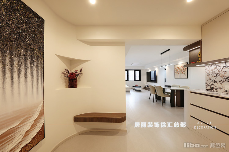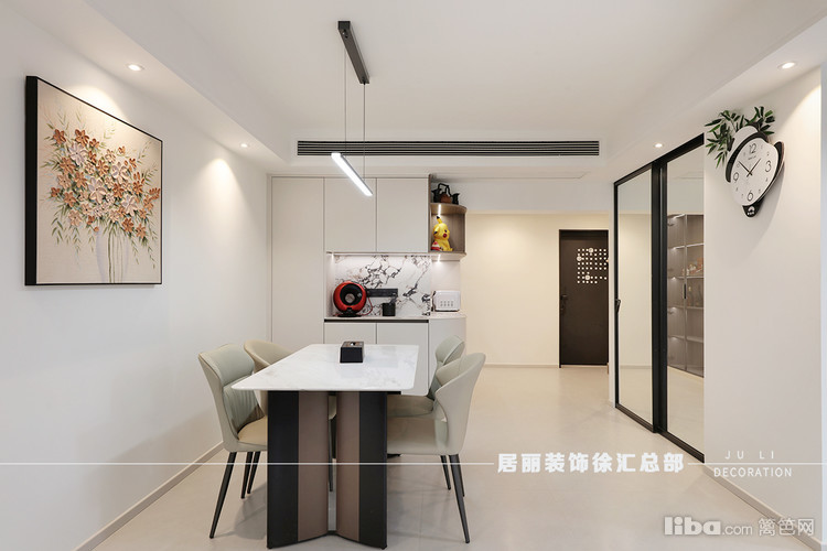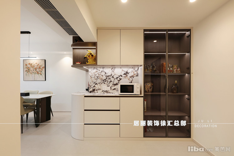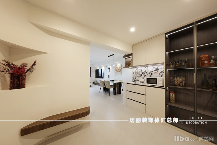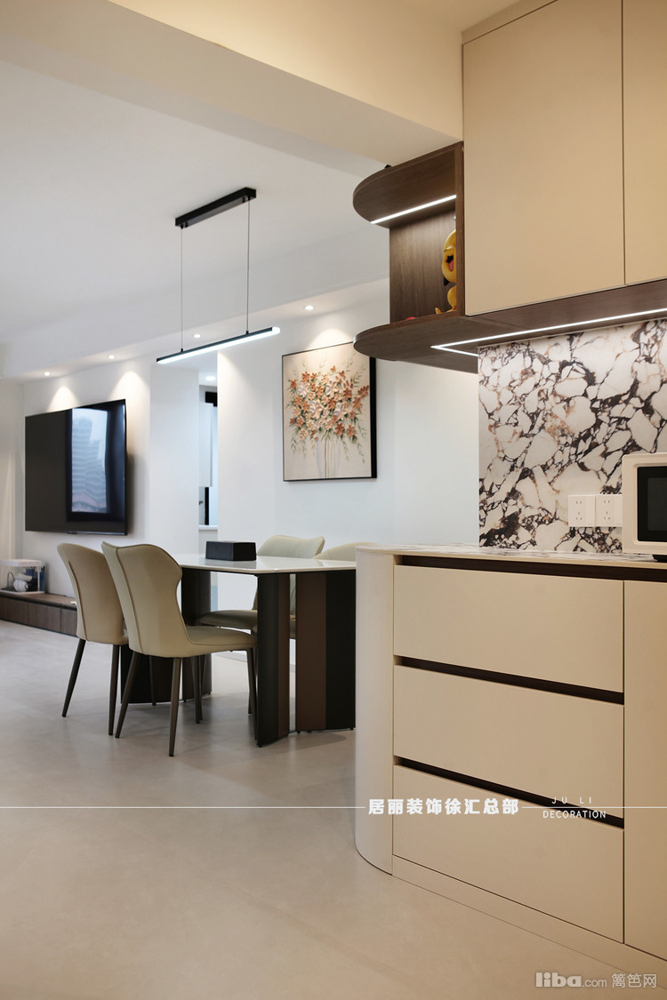餐桌旁做了一些餐边柜,涂料牛奶白通刷墙面。