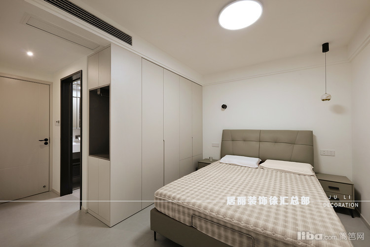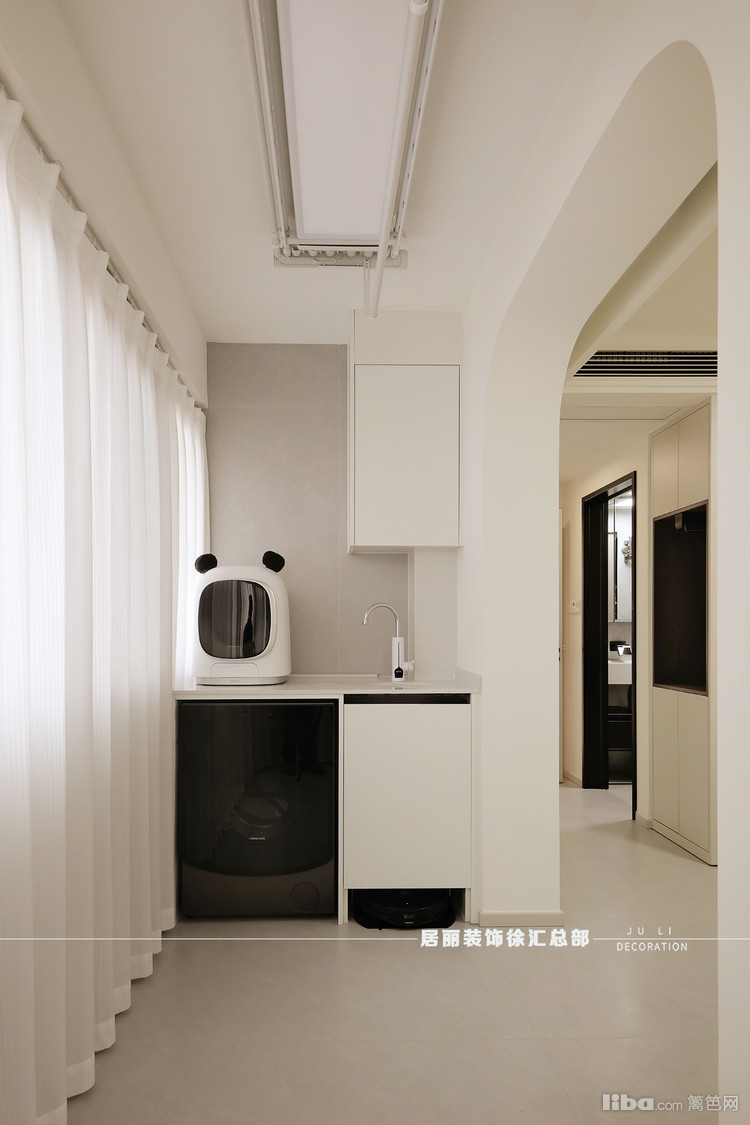 由于主卧面积不大,业主希望和阳台结合在一起。采用全屋定制和活动家具相结合。阳台洗衣机台盆除了洗衣机外,还增加了内衣洗衣机和扫地机器人。