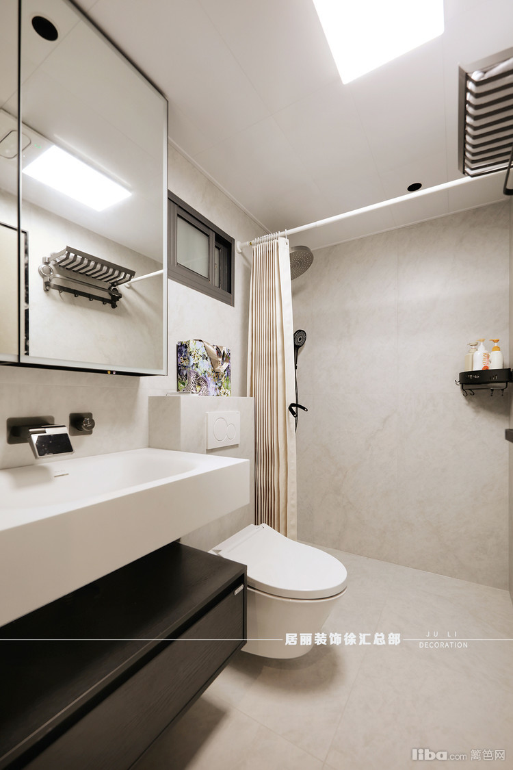 原本户型只有一个卫生间,业主希望变成两个卫生间,方便家里两代人使用。所以设计师将客卫生间设计成干湿分离