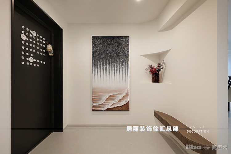玄关处,设计师做了石膏板造型墙对玄关区进行装饰,利用圆弧造型弱化了房梁。在造型墙的后面做了一个储物区,方便储物和收纳日常替换衣物等。