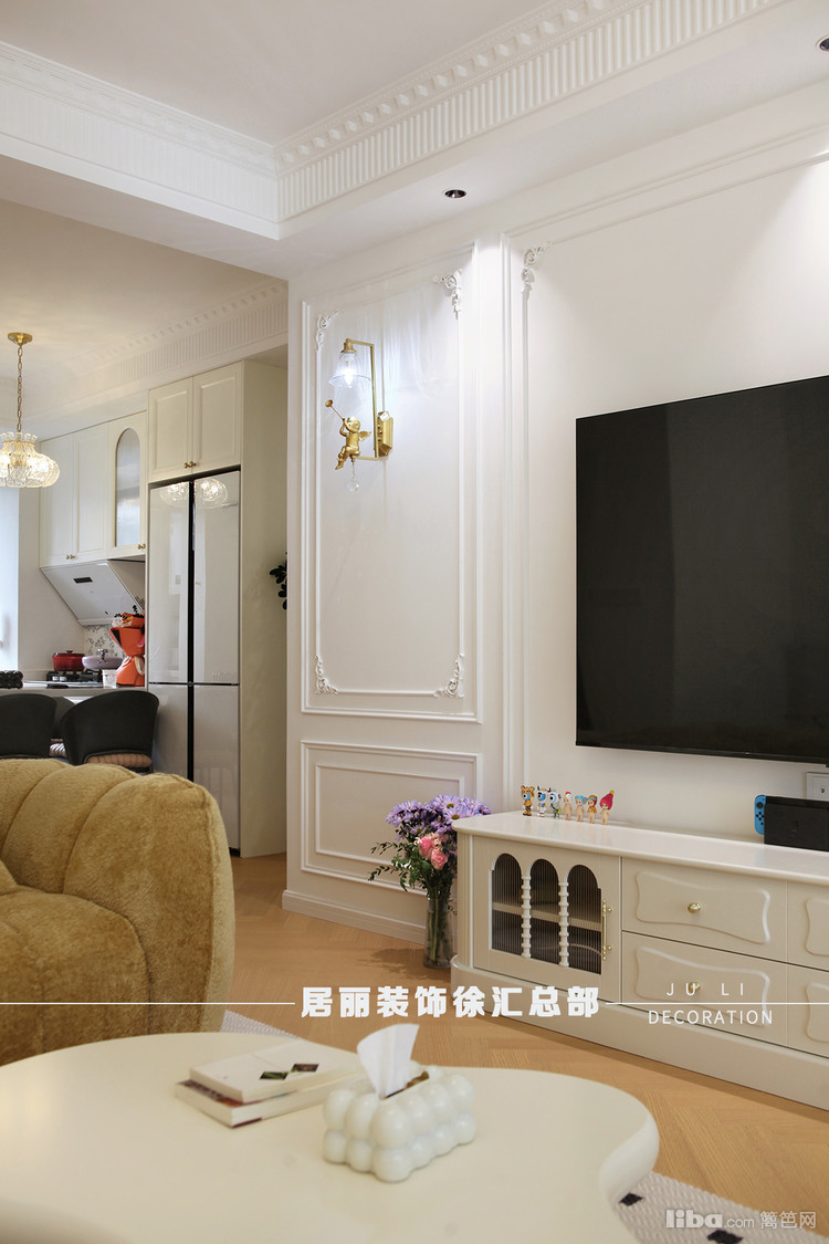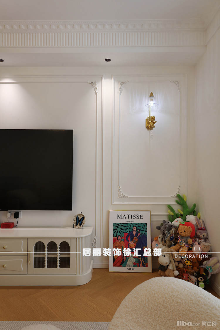 所以在本案客厅电视机这面墙上设计了简单的线条设计,搭配精美的壁灯,想法式宫廷的效果更浓郁些