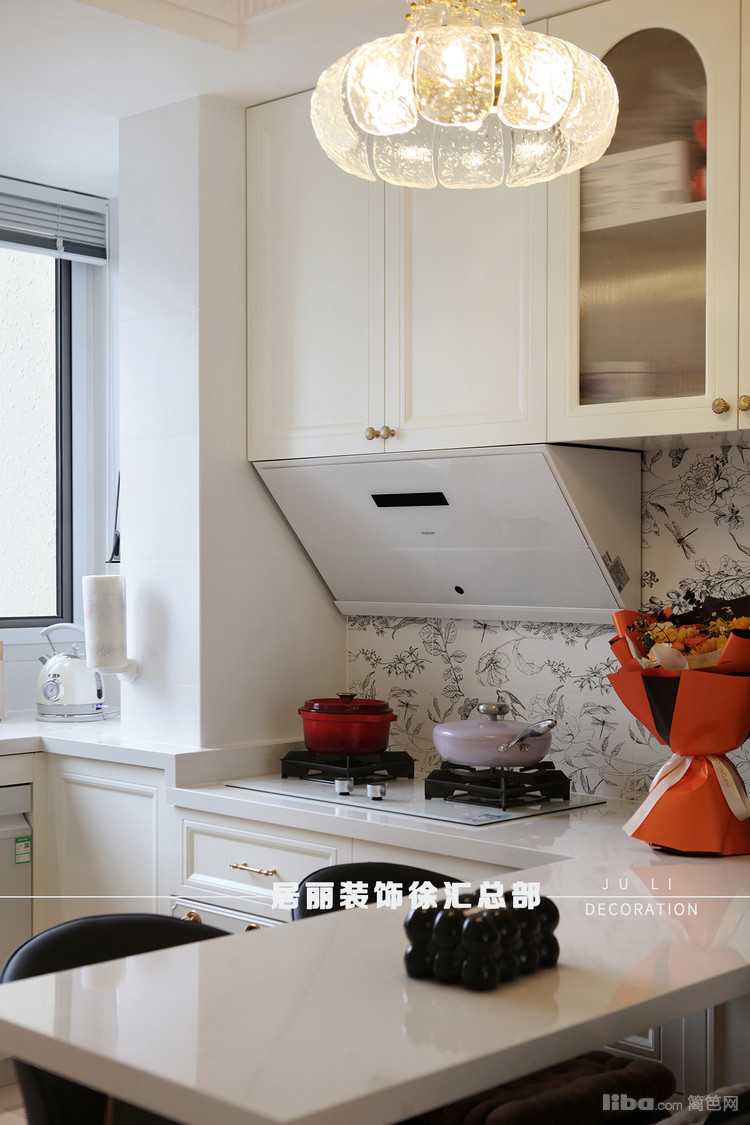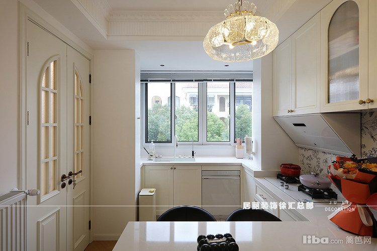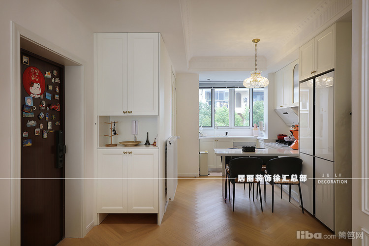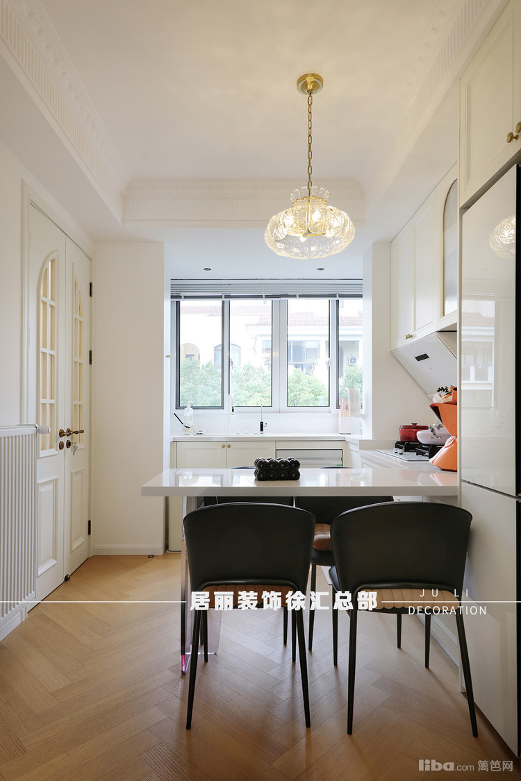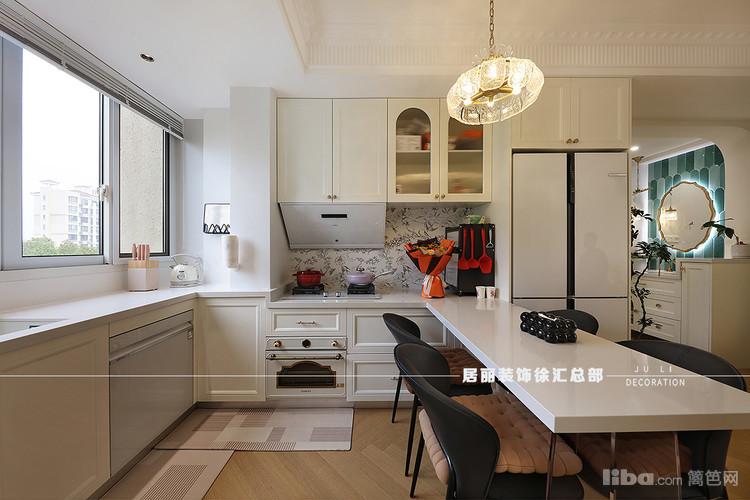 厨房位于整个房间的北面。北阳台和餐厅这块区域整合在一起。厨房与吧台餐桌采用U型橱柜,电器区、烹饪区和操作台依次排开。