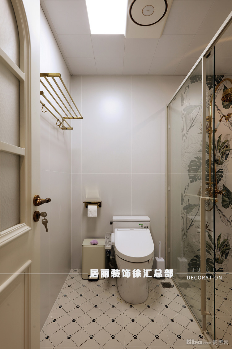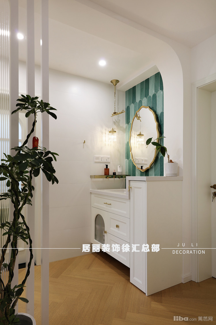 卫生间采用了干湿分离的设计。干区渐变色的叶片墙砖很抢眼,搭配上精致的小吊灯,让人眼前一亮。