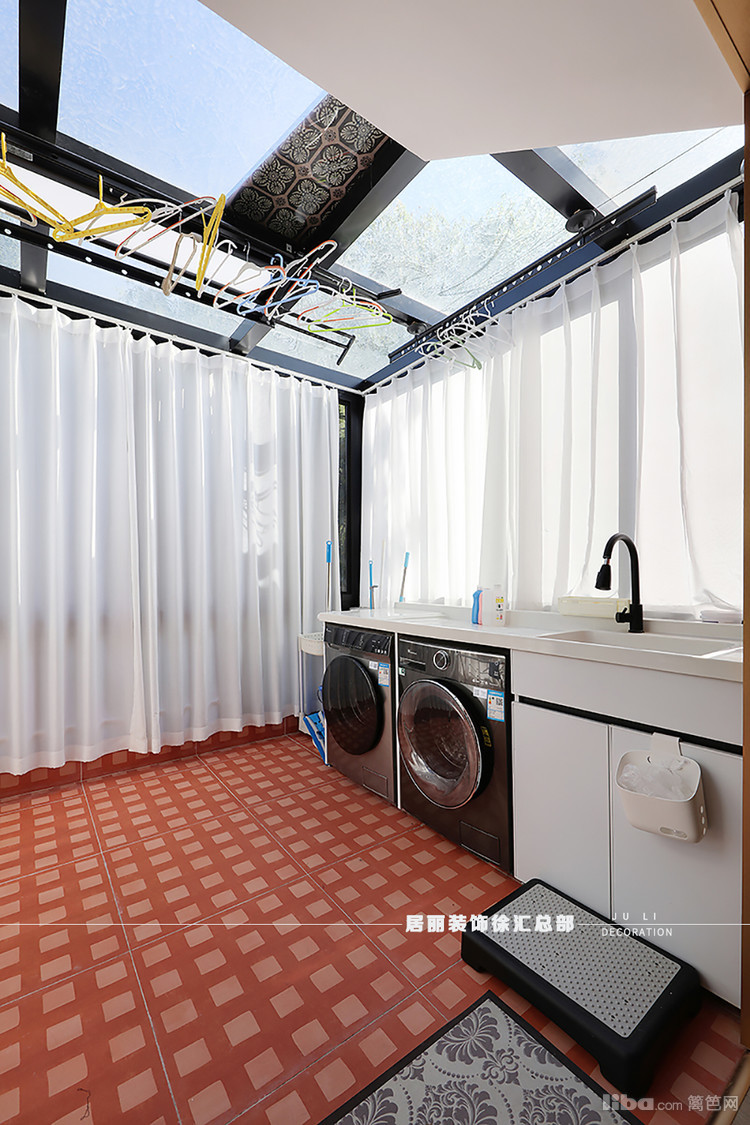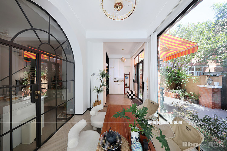 用红砖 + 木纹围栏做基底,保留烟火气;搭配黑色铁艺灯、拱形门,添点复古精致感;