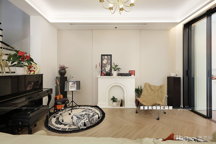 利用楼梯旁的留白空间,放钢琴+吉他+地毯,打造随时能放松的音乐角
