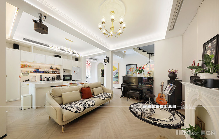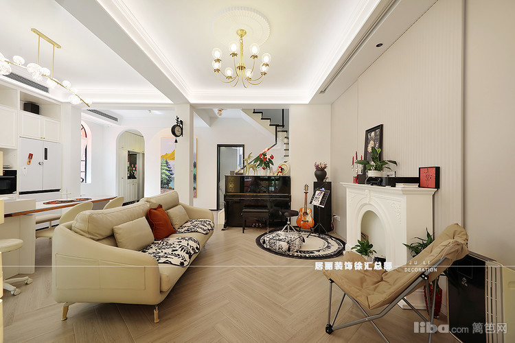 用奶白 + 浅米做基调,搭配石膏顶角线、白色壁炉、拱门造型,温柔又精致;