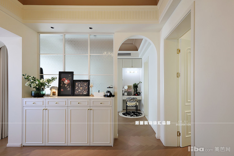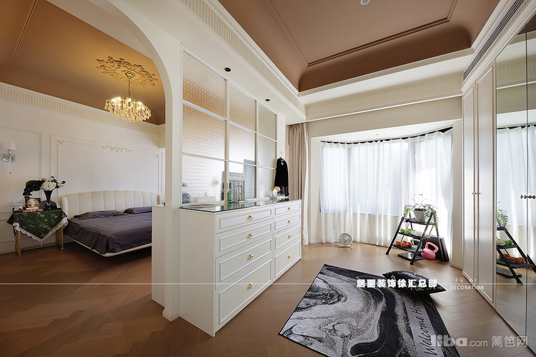 用拱门+玻璃砖隔断,把卧室、衣帽间、梳妆台做了软性分区既保持空间通透不压抑