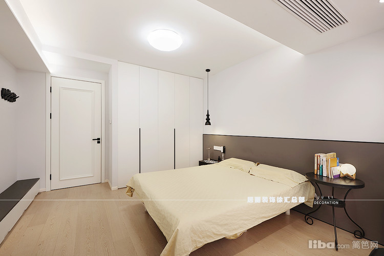 弱化空间的单调感,床头柜选了带纹理的黑色款,小体量却能提细节精致度,浅黄床品+柔光灯带,