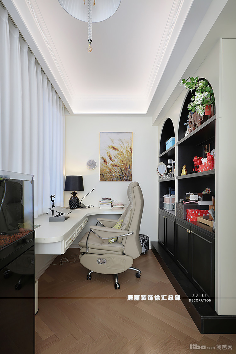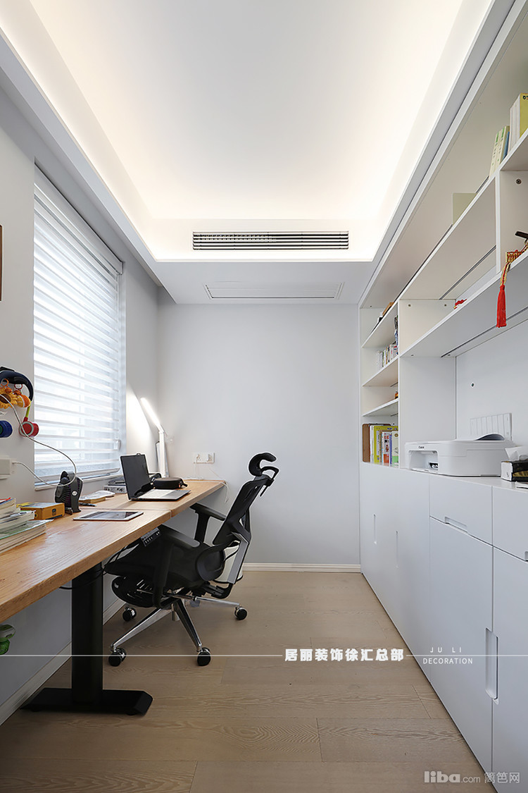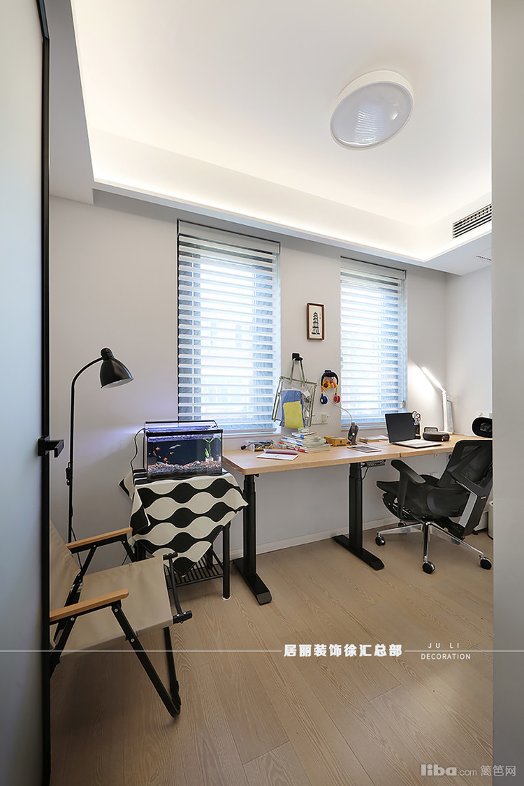 墙面做整排收纳柜,把书籍、打印机等杂物藏起,保持桌面整洁,加入鱼缸、小摆件,