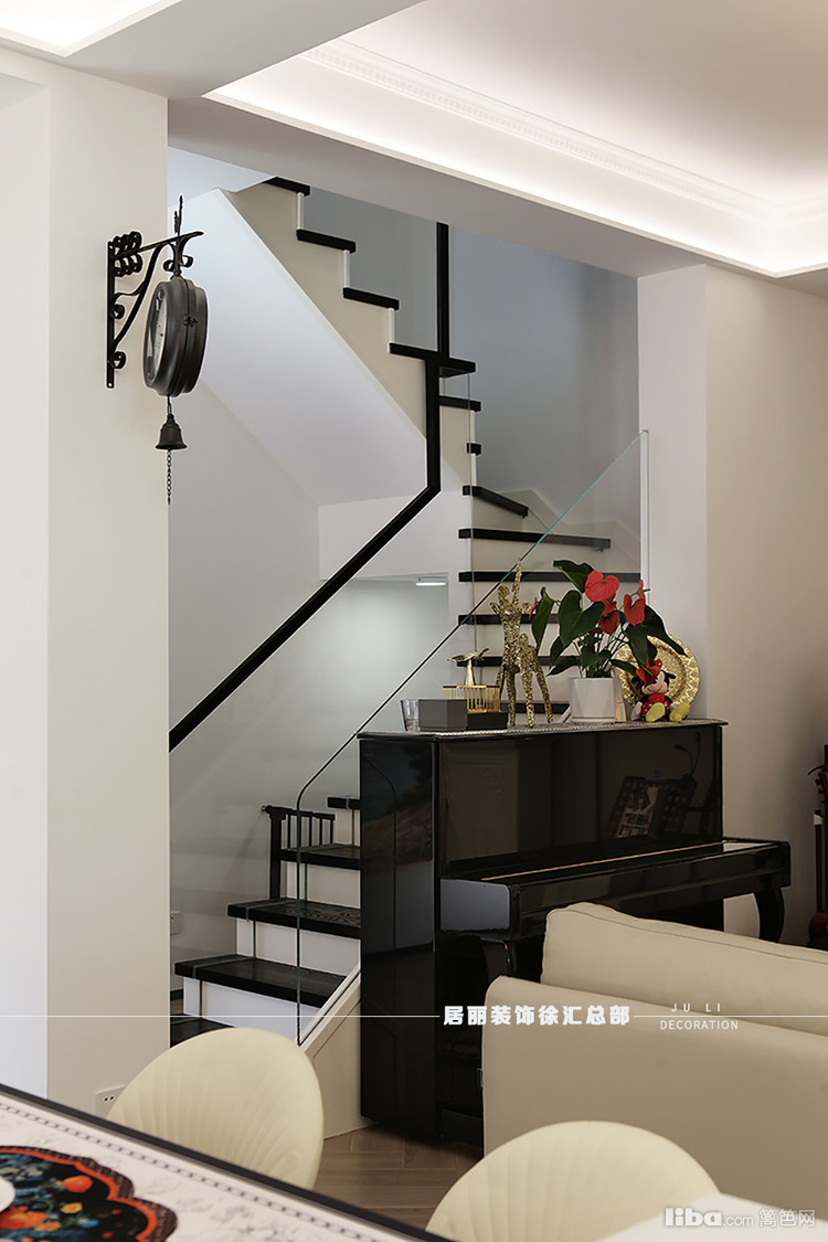 用黑色实木踏步+透明玻璃扶手,弱化楼梯的厚重感,让狭窄的楼梯间更通透;黑色扶手的线条利落,和整体的温柔感形成轻对比,不沉闷也不跳脱。