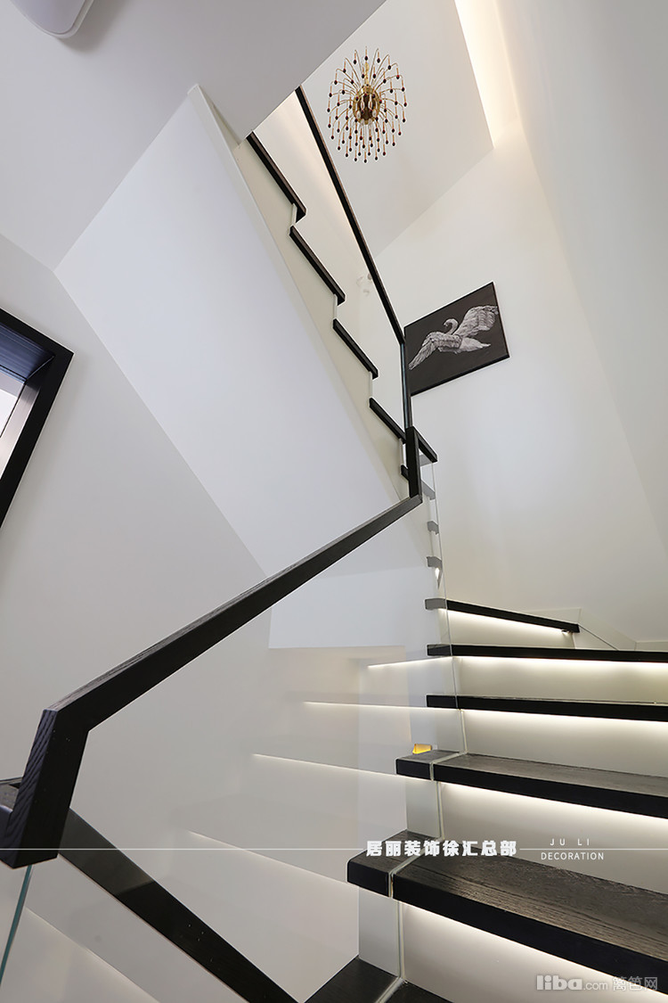 踏步底部嵌入隐形灯带,既解决了楼梯间的照明问题,暖光又能柔化黑白材质的冷感,