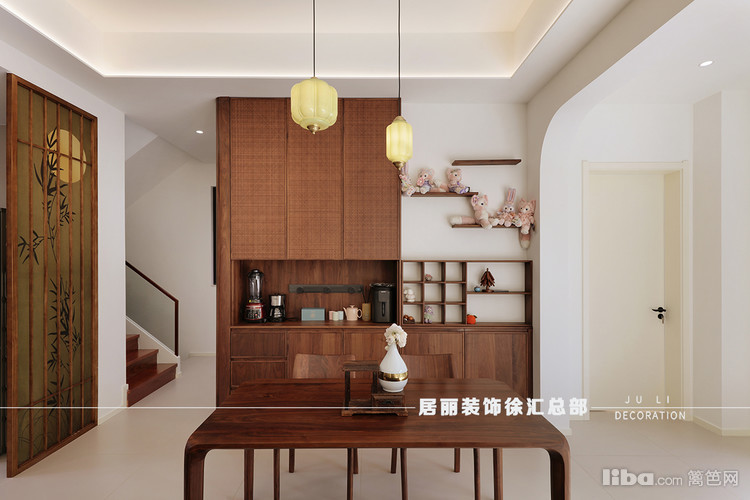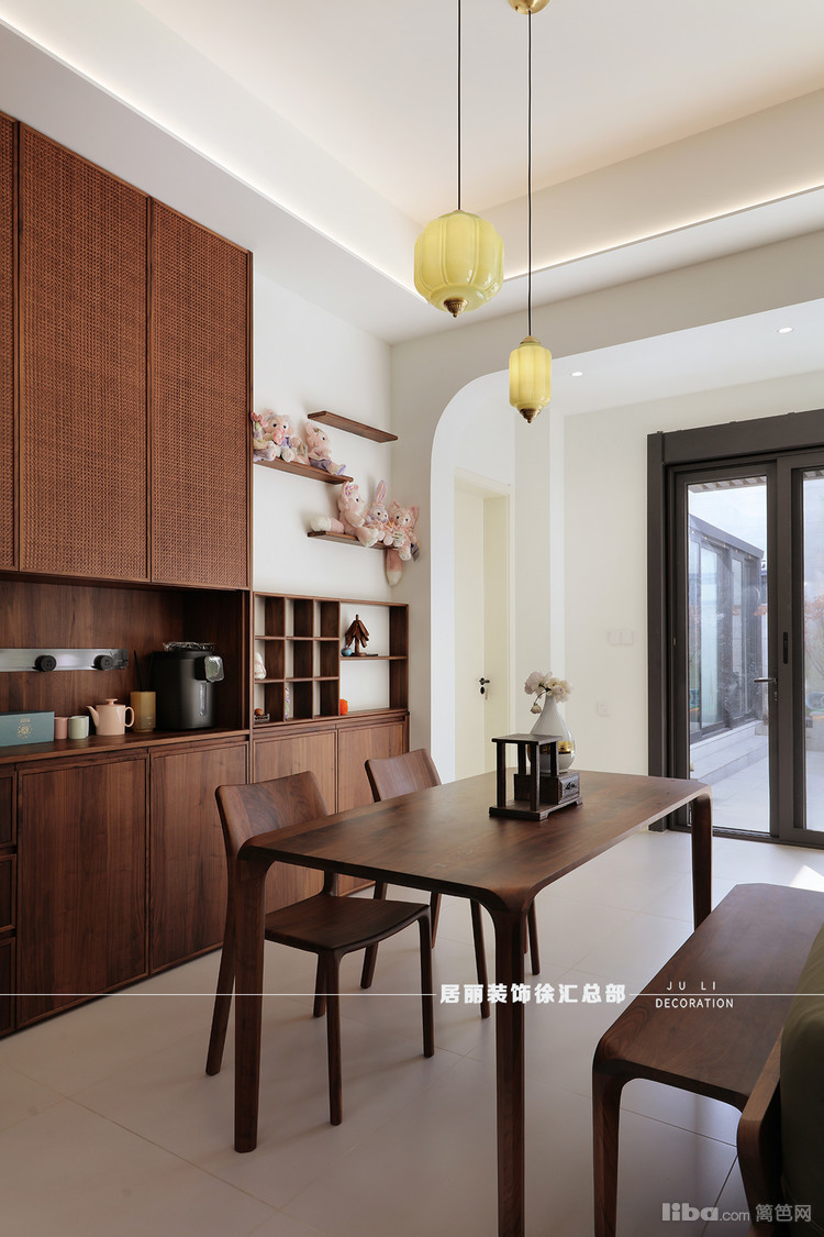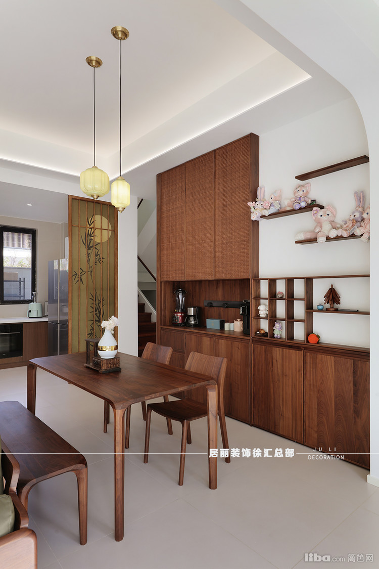 把卧室门移位,扩大餐厅空间,并将餐边柜延伸至此。提升物品收纳功能,利落有序的柜体规划,为区域扫除凌乱。。