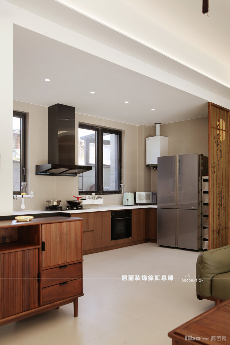 墙面采用奶油色哑光砖,釉面耐磨光滑好打理,配上天然胡桃木材质的橱柜,