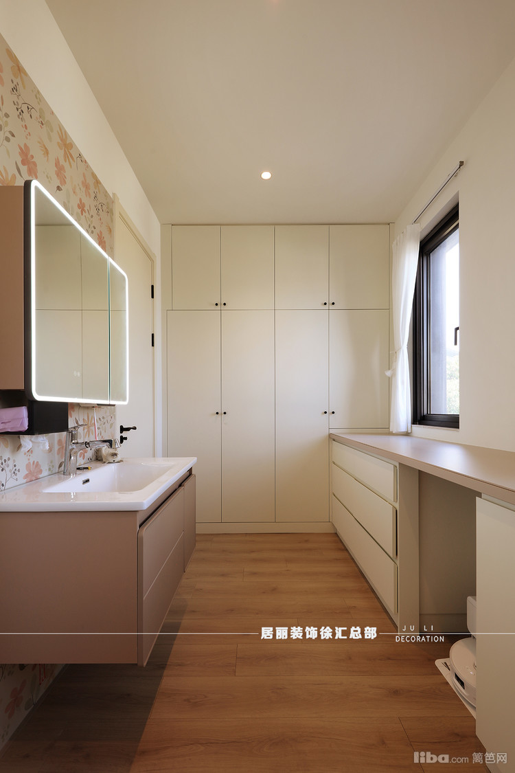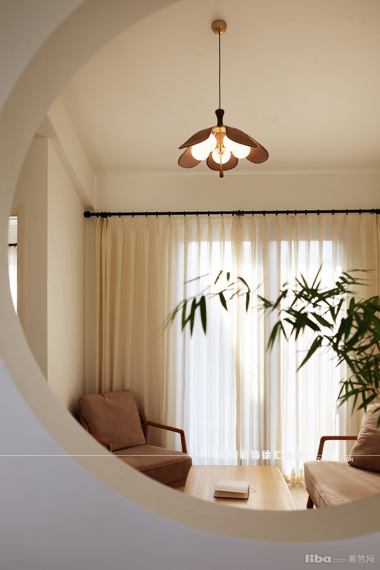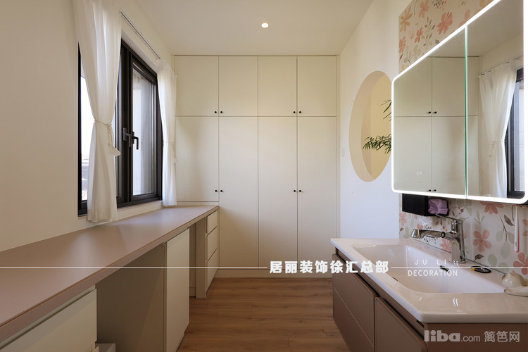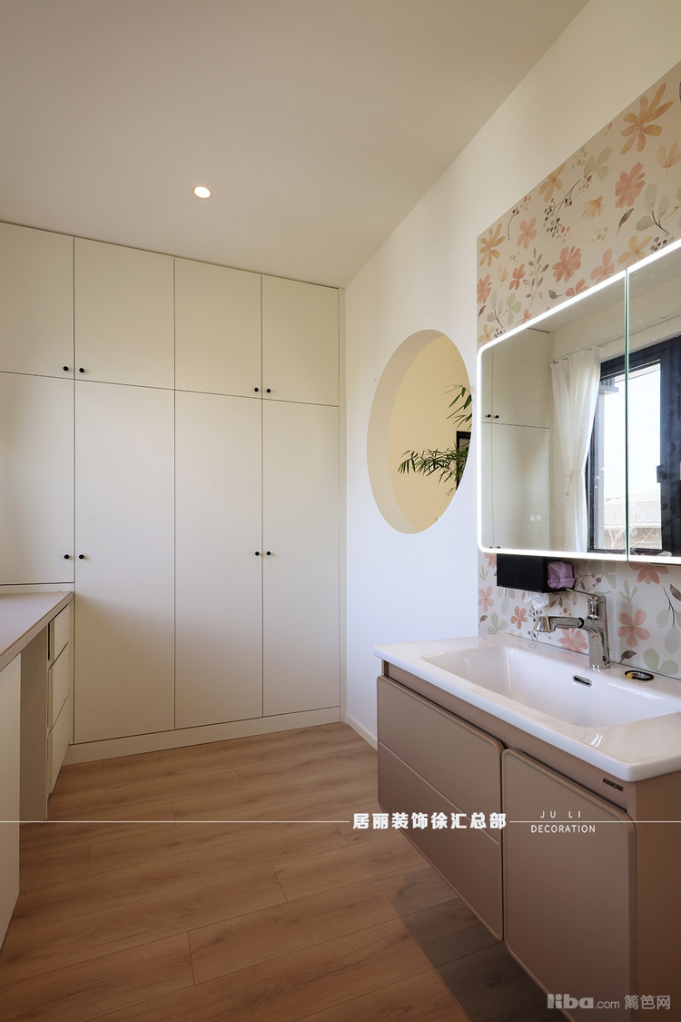 衣帽间和卫生间打通,全部套入主卧。衣帽间和多功能厅之间留出一个圆形轩窗,象征圆圆满满,恰似一个画框,框住了四季的变换与人间的烟火。